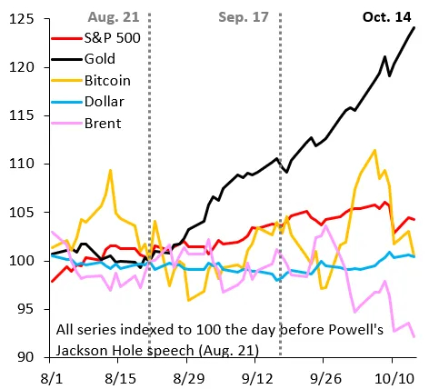原因是,主流发达国家的货币都被质疑了,不仅是美元,欧元、日元、英镑这些货币,哪个是靠谱的?指标都恶化了。引爆点是8月22日美联储改变态度要降息,结束紧缩。