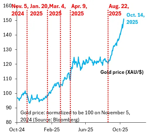 从8月下旬起,9月和10月的金价上涨,和美元关系没有这么密切。图二,美元指数从8月1日起是稳定的,没有贬值,还有点小反弹。但黄金就快速突破3500,这都4200以上了。