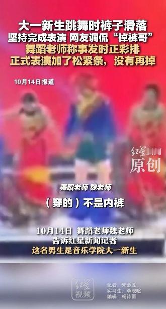 掉裤子也能一夜爆红?四川乐山师范学院音乐学院迎新晚会彩排现场惊现“名场面”,音乐学院大一男生舞台跳舞,运动裤突然从腰间“溜走”,但他愣是没停,硬气地把整支舞跳完,动作一气呵成,毫不见怯。彩排现场不少同学顿时看傻眼,这段“裤掉舞蹈”视频一上传网络,瞬间引燃讨论区,网友纷纷封他为“掉裤哥”。 评论区炸了锅,调侃的、点赞的“网络群众演员”热情疯狂。有网友直接说这是年度最佳爆笑现场,也有人关心小伙心理,“当场掉裤也不慌,不容易!”男生本人下场留言澄清,怕吃瓜网民误会,专门解释穿的是运动短裤绝非内裤,防止更多乌龙。舞蹈指导魏老师事后直言小伙并不尴尬,反而对意外一夜爆火自得其乐,还主动和大家分享经历。老师为保险起见,正式表演前特意给他的裤子加了松紧条,说是装了“防滑锁”,晚会当天表演顺利,“裤门”没有再现。 迎新晚会突发“裤袋惊魂”,男生硬核淡定圈粉无数。你虽然笑了,但敢不敢想象,如果换做你在这种又尬又刺激的现场,会不会比“掉裤哥”更镇定?这么爆笑的意外,你觉得是名场面的幸运还是社死的尴尬?