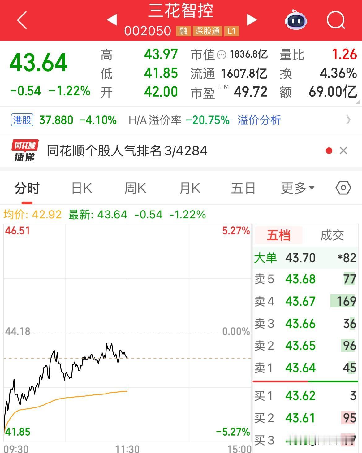真是假是,谁知道,大额订单澄清!三花顺势低开,但还是低开震荡走高,才跌1.22%