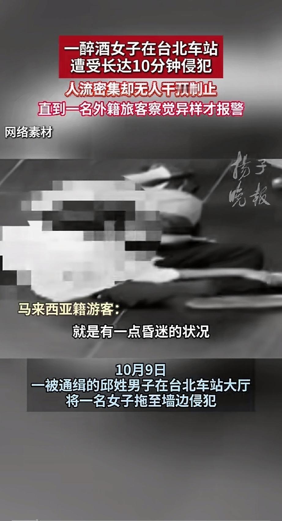 台北车站这么多人,他居然有生理反应下得去手。 一女子醉酒在台北车站被拖到墙角性侵,关键问题是,她被侵犯长达十分钟没有人制止,最后竟然还是让外国的马来西亚人报警制止,这我们华人的脸面往哪里搁? 难道台湾都是于北辰,王世坚之流, “坚辰当道”吗? 台湾