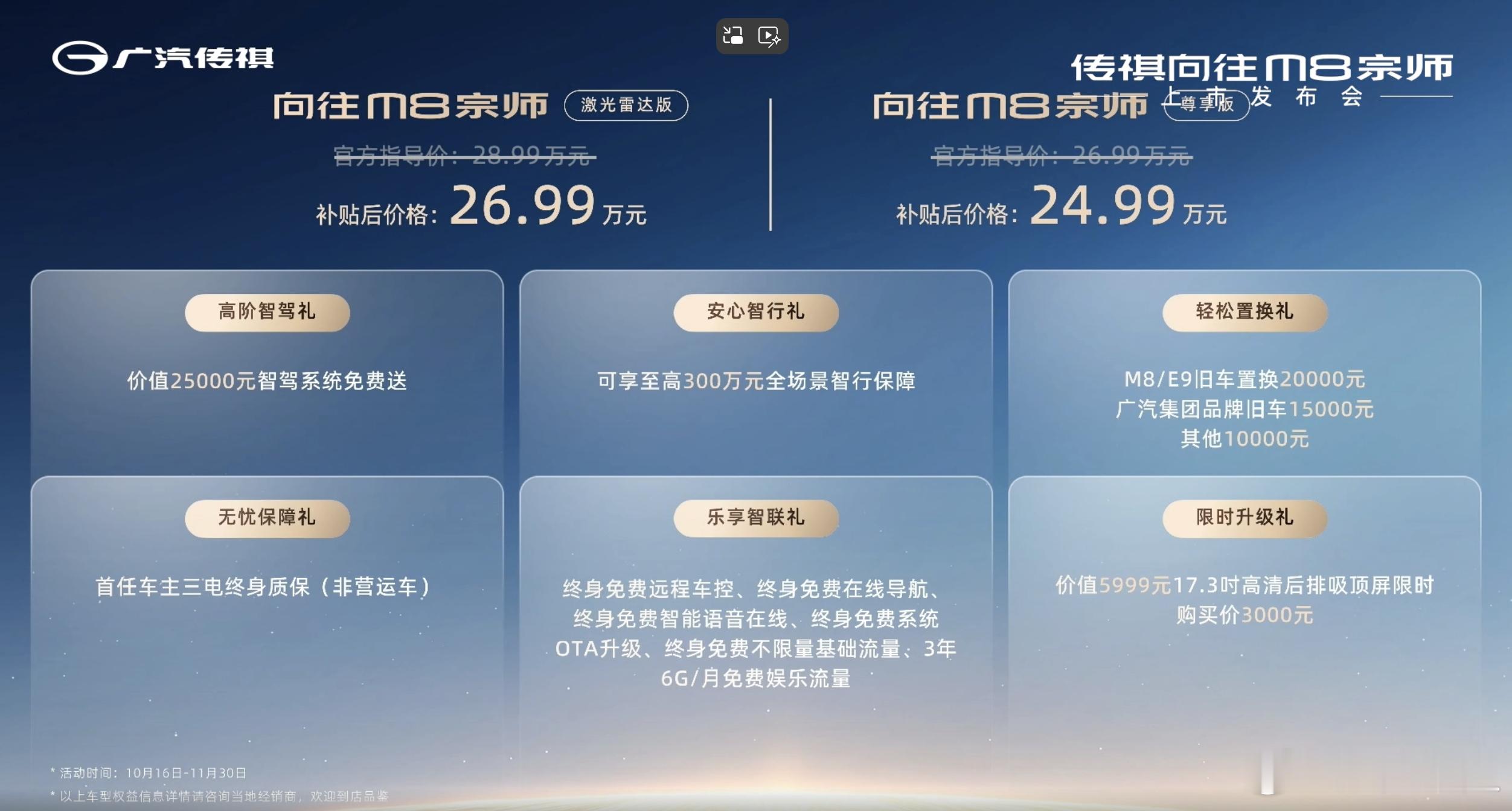 传祺M8宗师版价格来了!限时24.99万起,顶配才26.99万,这价格也太香了吧!直接把带激光雷达的高阶智驾MPV打到了27万以内!价值两万五的智驾系统,现在居然免费送!周鹏力荐向往M8宗师