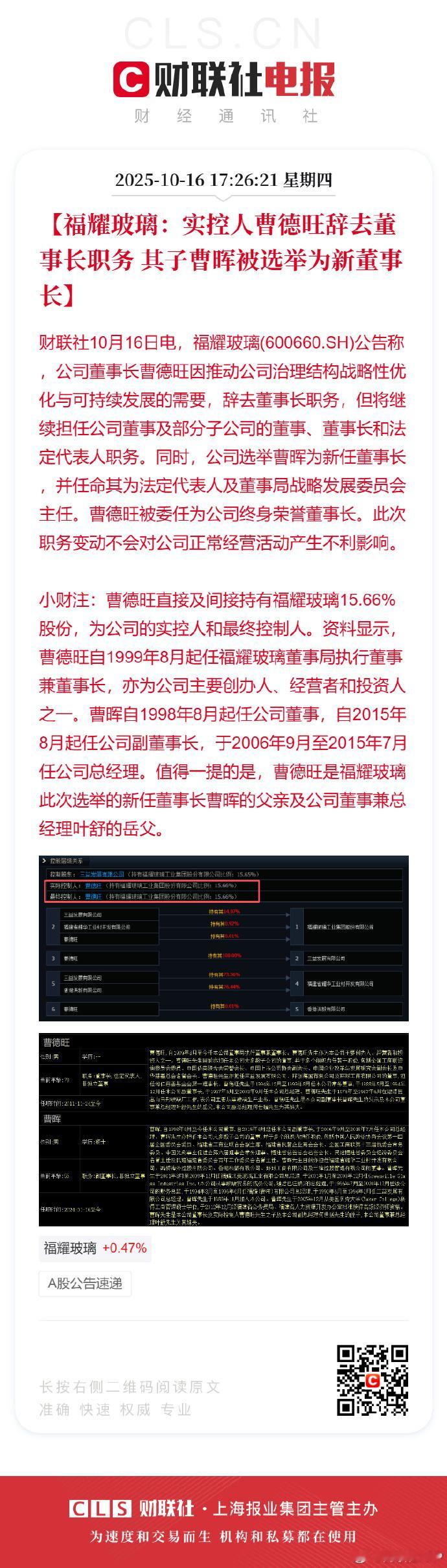 曹德旺辞去福耀董事长职务【福耀玻璃:曹德旺辞去董事长职务 选举曹晖为新董事长】曹德旺辞去福耀玻璃董事长职务10月16日,福耀玻璃宣布曹德旺辞去董事长职务,由其子曹晖接任。曹德旺转任终身荣誉董事长,将继续参与公司治理。此次交接旨在优化公司治理结构,确保可持续发展。