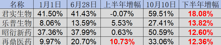 尤其值得注意的是,君实生物、乐普生物、再鼎医药、昭衍新药。不同于名单中的绝大多数公司是在上半年形成加仓的,这四家公司的港股通持仓增加主要发生在下半年。港股通南向资金在下半年对于君实生物、乐普生物、再鼎医药、昭衍新药的加仓比例全部超过12%。