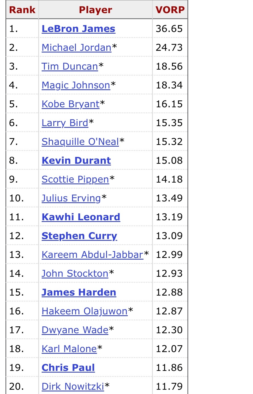 NBA季后赛历史胜利贡献值(VORP)排名,不知詹姆斯是否还有机会改写自己的数值。[思考]
