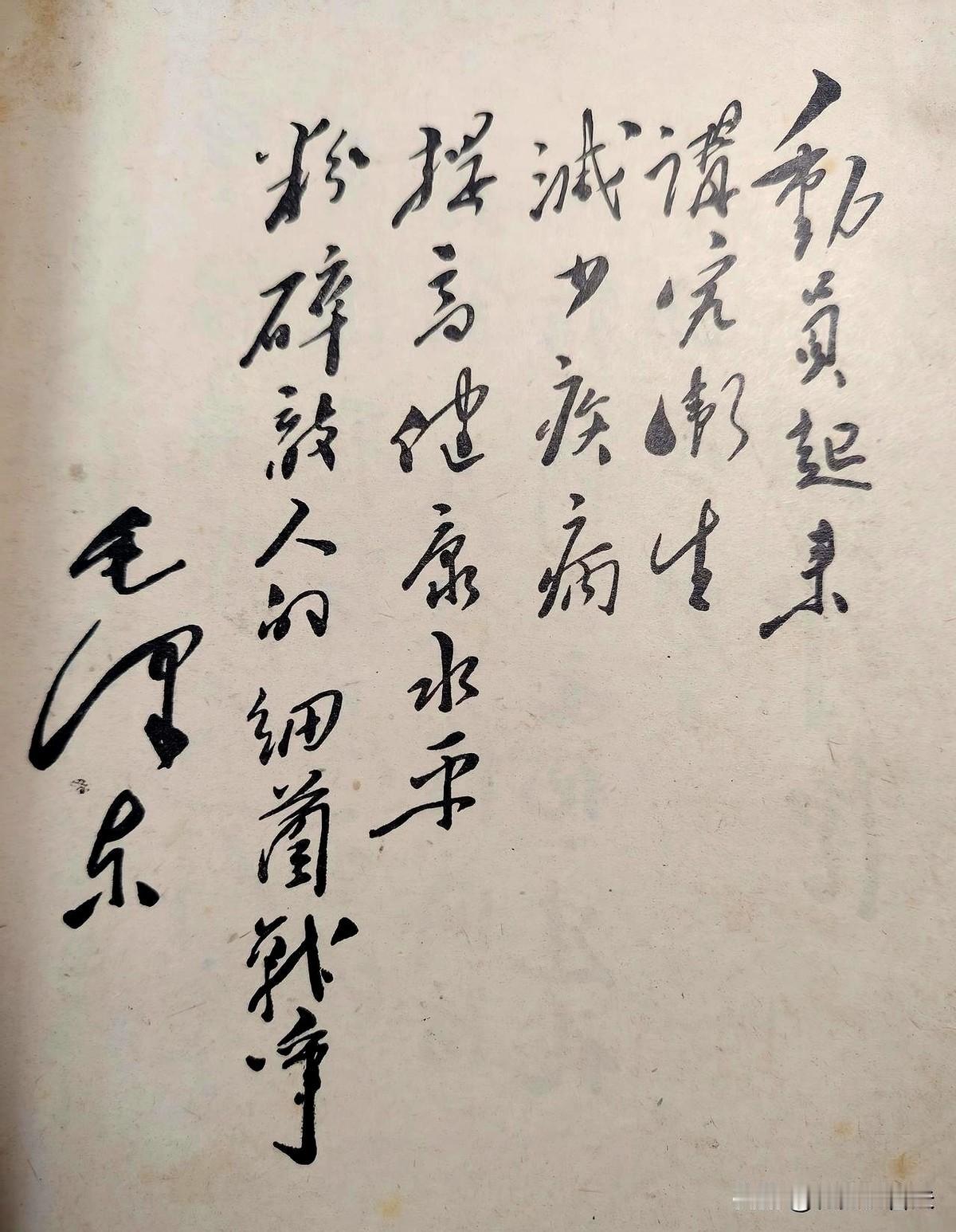 这个题词很少见,是为1953年第一期《人民军医》的题词,全文带落款才30字。 全文如下: 动员起来,讲究卫生,减少疾病,提高健康水平,粉碎敌人的细菌战争。 毛泽东 网友对此说道: 书法行云流水,内容到今天也极具指导意义,看看新冠给我们带来的灾难,老人家的话永不过时。 动员起来 讲究卫生 减少疾病 提高健康水平 粉碎敌人的细菌战争 动员起来,讲究卫生,减少疾病,提高健康水平,粉碎敌人的细菌战争 动员起来 讲究卫生 减少疾病 提高健康水平 粉碎敌人的细菌战争 毛主席的字有繁体,猛一看还真认不出。
