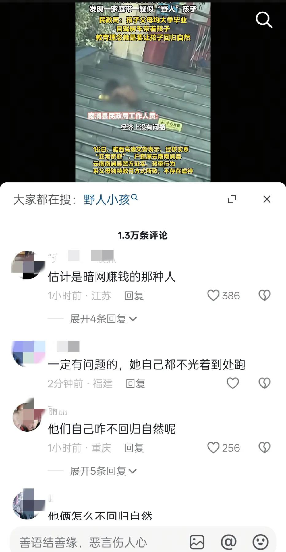 一位网友在四川发现一个家庭带着一个疑似“野人”的孩子,小孩的行为举动像“犬”,于是报了警,得到回应是正常人,小孩不是“野人”。是他父母的教育理念跟别人不一样,孩子父母就是想要自己的小孩去“回归依然”,而且孩子父母的学历还不低,都是大学毕业的。 我看到有网友评论说: 让孩子回归自然,他的父母怎么不回归自然呢?还有的网友说:会不会是出于某种心理?大家怎么看?(注:请文明发言,理性看待。)