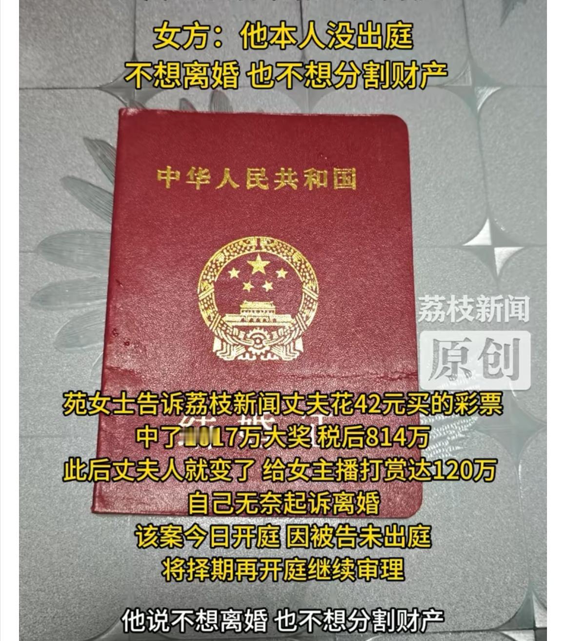 钱,真能检验人心?山东德州苑女士就遭遇了这样的糟心事:丈夫花42元买彩票中了1017万大奖,税后814万。本以为是幸福的起点,没想到却成了婚姻的终点。 曾经,苑女士和丈夫在一起近10年,虽不富裕但平淡幸福。可丈夫中奖后像变了个人,打赏女主播高达120万,还拿空卡骗她,甚至对她威胁恐吓。如今,苑女士起诉离婚,丈夫却不出庭,还不想离婚也不想分财产,这操作简直离谱。 这不是个例,生活中多少感情在金钱面前不堪一击。就像有的家庭,拆迁款一到手,兄弟姐妹为分财产反目成仇;还有的夫妻,一方突然暴富,就开始嫌弃另一半,闹得家庭鸡飞狗跳。 在婚姻里,信任和忠诚是基石。可这丈夫的行为,无疑是把基石敲得粉碎。巨额财富不该成为感情的终结者,而是幸福的助推剂。如果连最基本的信任和忠诚都没了,那这婚姻还有什么意义? 真心希望苑女士能早日得到公正的判决,拿回属于自己的那份财产,也希望她能走出这段阴霾,重新找到属于自己的幸福。当面对财富的诱惑时,每个人都该守住本心,别让金钱蒙蔽了双眼,毁了原本美好的生活。别让一时的幸运,变成一生的不幸。