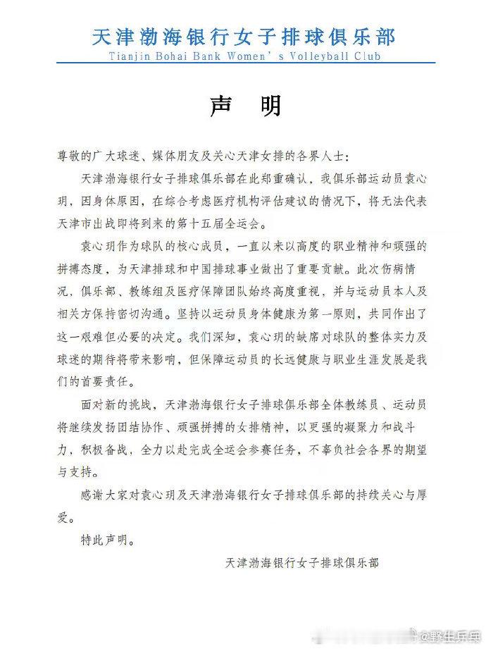 袁心玥因伤病缺席全运会发布声明,袁心玥因身体原因,在综合考虑医疗机构评估建议的情况下,将无法代表天津市出战即将到来的第十五届全运会。第十五届全运会 ​​​