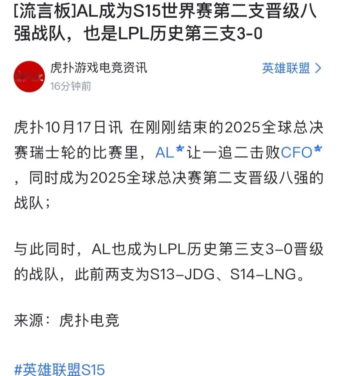 AL成为S15世界赛第二支晋级八强战队。 不得不说提前出线虽好,但也真的很担心很长时间不打比赛会找不到竞技状态,这场比赛看得我真是心惊肉跳的,已经有很大的劣势没想到还能打回来。希望在等待其他队伍的时候不要松懈,加油认真研究版本,cfo的换线理解真的很棒,一直进步下去吧al。