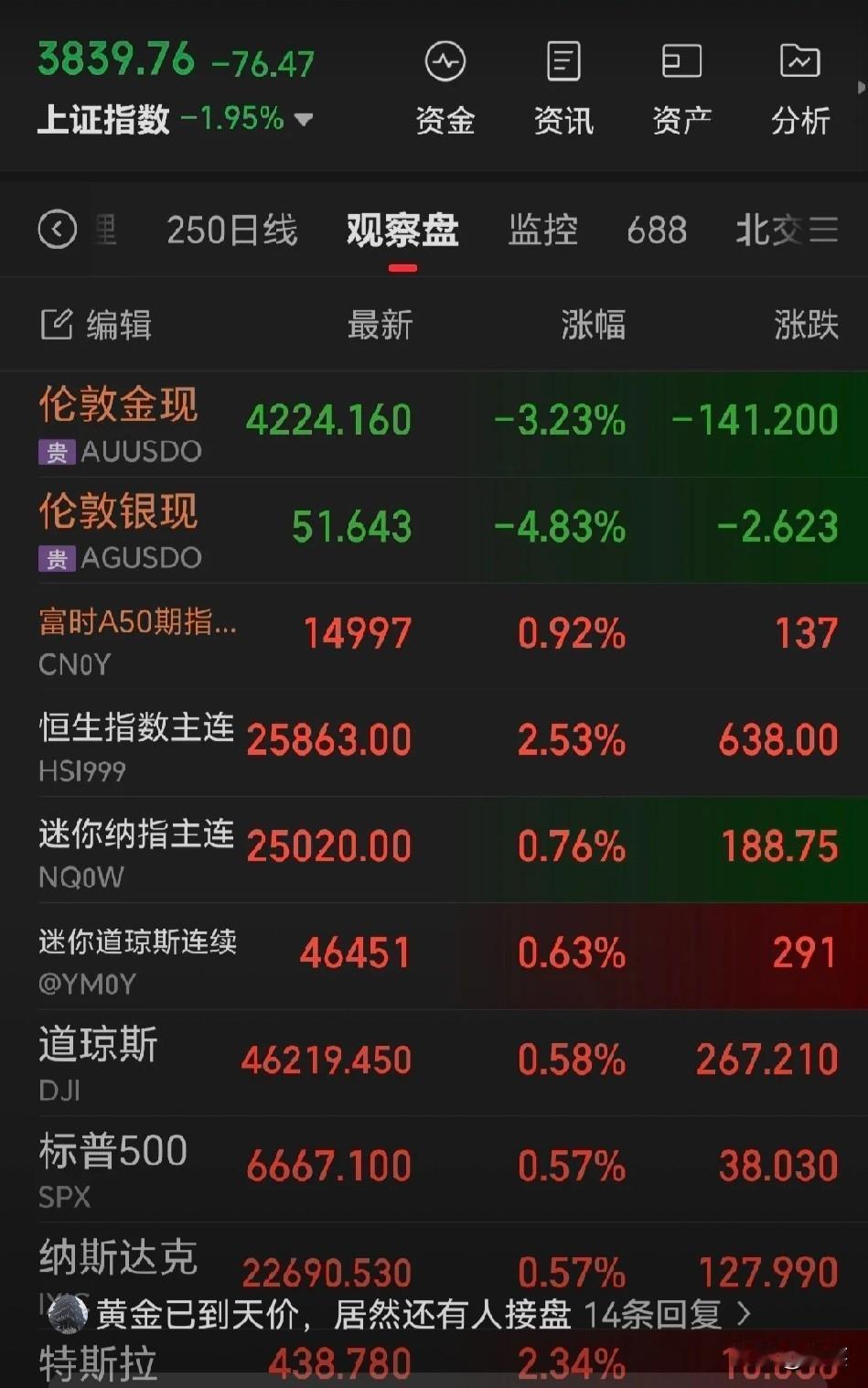 半夜醒来,被金融市场的上涨惊到了,更被黄金白银的跌幅吓到了。 夜盘美股三大指数全部低开高走,国内A50期货大涨1%,恒生港股期货大涨2.5%,伦敦现货黄金跌3%,白银下跌5%! 其实这样反而踏实,这不就是市场该有的样子吗?以前都是股市跌、黄金涨避险,自从黄金走牛,反倒有点反常。现在股市回暖资金回流,黄金白银回调,反倒像回到了熟悉的正常节奏。 看来市场逻辑还是没跑偏,只是之前黄金太火盖过了规律。你们觉得这波回调后,黄金还能回到之前的牛市节奏不?黄金大盘价行情 美股盘后重挫