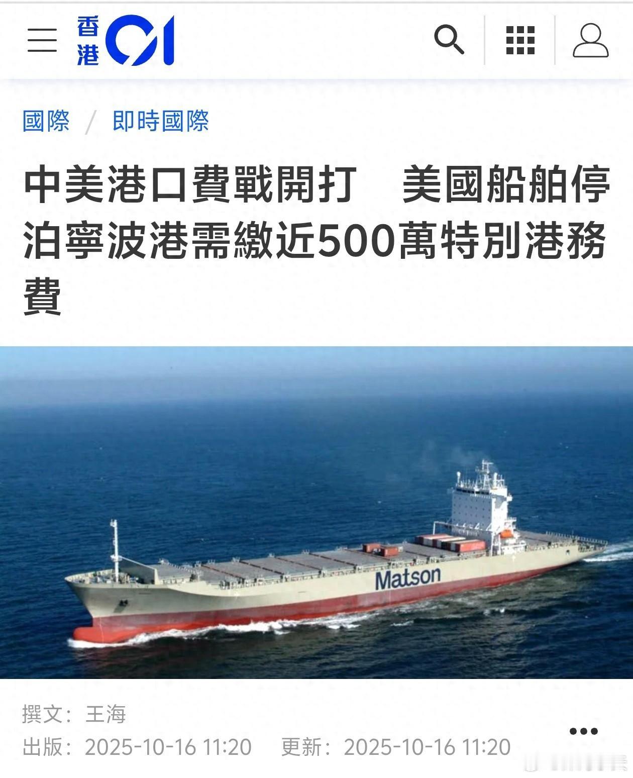 靠港费暴涨3562万,美船东:我每艘船每次去中国,我的心都在滴血 一张天价账单,搅得全球航运圈不得安生。美森轮船公司那艘“曼努凯”号刚从宁波港离开,手里攥着62.7万美元的特别港务费账单。 这可不是普通的收据,而是一场大戏的开场锣,账单背后,是美国船东的无奈心声——每艘船,每次靠中国港口,都像在割肉。 事情其实很简单。中国交通运输部一纸新规,正式对五类美国关联船舶收起了“特别港务费”:只要是美资控股、美籍运营、美国制造、悬挂美国旗,或者美资持股超过四分之一的船舶,统统得掏腰包,每净吨400元人民币,这还只是个起步价,未来几年还要往上窜,到2028年直接冲到每净吨1120元。 光听数字没啥感觉,实际上一艘3万吨的干散货船,单次靠港的费用就能飙到千万美元级别,这账单分分钟比船上拉的货还贵。 美国上市公司赛诺吉的CEO摊开手直呼“心在滴血”,说是公司每艘船进一次中国港口,光靠港费就高达3562万人民币。这样的“川普税”,刀刀见血,没人觉得轻松。 要说这事的来龙去脉,得追溯到今年4月。美国那边忽然翻起老账,搞了个301调查,决定对中国船舶收一笔“特别港务费”,每净吨50美元,一刀切,10月14日正式生效。 中国这边可没忍气吞声,直接拿出对等反制。你怎么收我,我就怎么收你,连标准都比美方设得细致到骨头缝,精准瞄准美国关联船舶。 中国媒体也很干脆,说这就是为了维护自身利益,谁来砸场子,咱就得还回去。只不过,全球海运市场里,中美分量大不一样,这笔账最后还是砸在了美国自家船东头上。 账单一出,全球航运圈都炸了锅。德国赫伯罗特直接取消了宁波停靠,改道釜山;马士基的货轮在太平洋上调头,开往韩国光阳港,航线临时大变脸。 美国船运公司那边更热闹,董事会连夜加班,琢磨怎么把美籍董事比例降到25%以下,想尽办法钻空子,连CEO都忍不住吐槽,这规避政策的操作比开船还累。 有的公司甚至打算把船舶注册地和建造厂都换个地儿,或者干脆换路线,先把货运到韩国再转运到中国,这一折腾,时间成本、燃油成本全都飙上天。 行业分析师看着这场混乱直摇头,说最后所有的成本都会转嫁给美国普通人。买杯咖啡都能涨价,谁还能觉得事不关己。 要知道,这一新规,全球大约15%的油轮和11%的集装箱船都受影响,影响的可不只是美国人。 表面上看,这是一场港口收费的小风波,实则背后是特朗普政府再一次掀起的贸易保护主义浪潮。美方自己点的火,烧到自家企业。“川普税”想让中国吃瘪,结果美国船东成了出血最多的那一个。 赛诺吉的老板摊开双手,眼看自家公司要扛下天价港务费,连问政策的美国官员都找不着,因为政府党争吵到快关门,连个主事的都没有。 美国内部的扯皮,直接让企业成了夹心饼干。每个美国船东都明白,这不是中国在“抢钱”,而是自家政府把压力推了回来。 政策像一把双刃剑,结果锋利的那头扎进了自己脚上。中国这招反制精准到位,直接让美国企业尝到了“保护主义”的苦果。 回头看,“曼努凯”号离开宁波那一刻,仿佛给一个时代画上了句号。过去几十年,全球航运成本可控,自由贸易说走就走,没人会为靠港费焦头烂额。 如今,一张账单让美国船东个个肉疼,正是美国政策的“反噬”现身说法。鲸鱼打架,虾米遭殃,美国自家的船运公司成了池中最无辜的鱼。 贸易战里没有赢家,谁点的火,谁就得付学费。这一笔千万美元的账单,终究会写进全球贸易的教科书里,提醒后来人别再把算盘打错了。 参考资料:“中方反制见效:首艘美国船只被罚446万元,航运公司想方设法规避损失” 2025-10-17 22:02·观察者网 马士基:两艘美线船不再挂靠中国港口! 2025-10-17 11:11·新浪财经