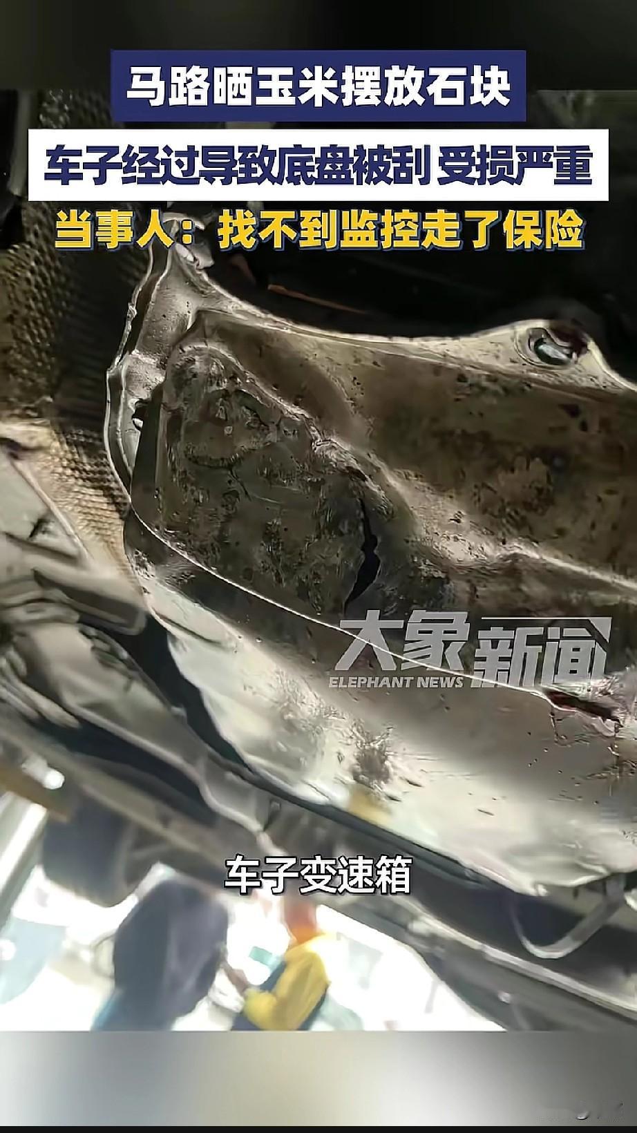 安徽淮北李女士开车经过马路晒的玉米地,撞上用来围挡的石头,车底盘、变速箱都刮坏了