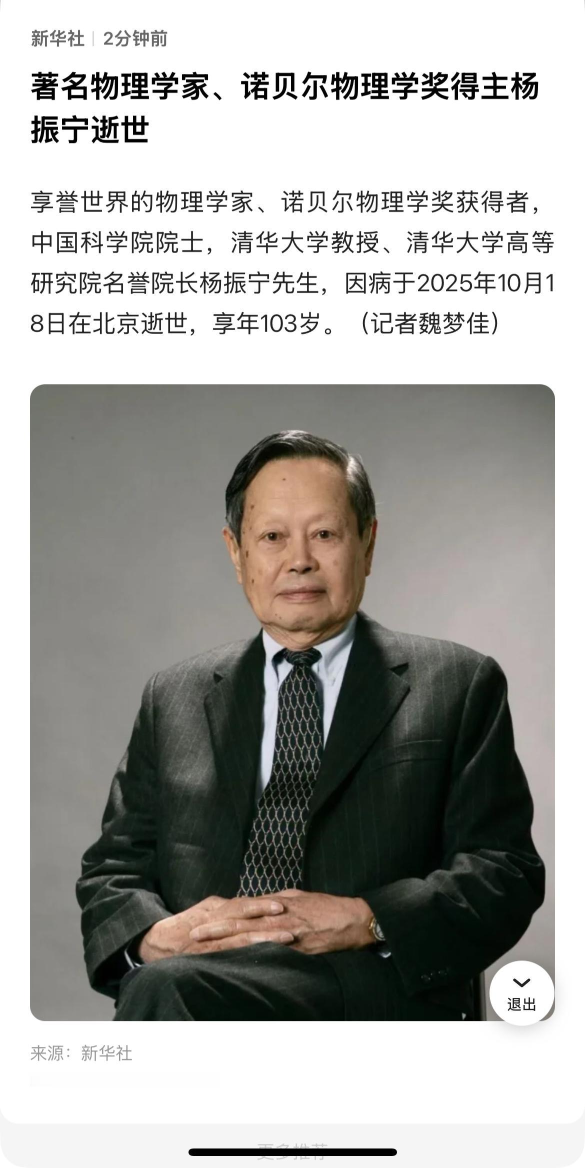 杨振宁逝世,享年105岁,是20世纪最杰出的理论物理学家之一,被誉为仅次于爱因斯坦的物理学大师。他与李政道于1956年提出宇称不守恒理论,颠覆了物理学长期坚持的对称定律,并于1957年共同获得诺贝尔物理学奖,成为首位获此殊荣的华人。此后,他提出的杨–米尔斯理论奠定了现代粒子物理标准模型的基础,对人类理解自然界基本规律产生了深远影响。 晚年,杨振宁推动中美学术交流,回国任清华大学教授。2004年与年轻学者翁帆结婚,二人感情深厚、相伴至今。杨振宁一生跨越中西,兼具科学智慧与人文情怀,被视为改变人类认知的伟大科学家。
