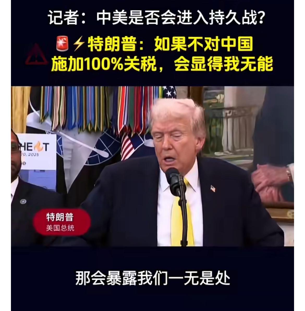 中美是否会陷入持久战? 特朗普宣称:“我们实施了100%的关税,要是不对中国加征关税,那就表明我们毫无作为!” 而对于我们而言,中国不惹事但也绝不怕事,若要谈,大门随时敞开;若要打,我们奉陪到底!