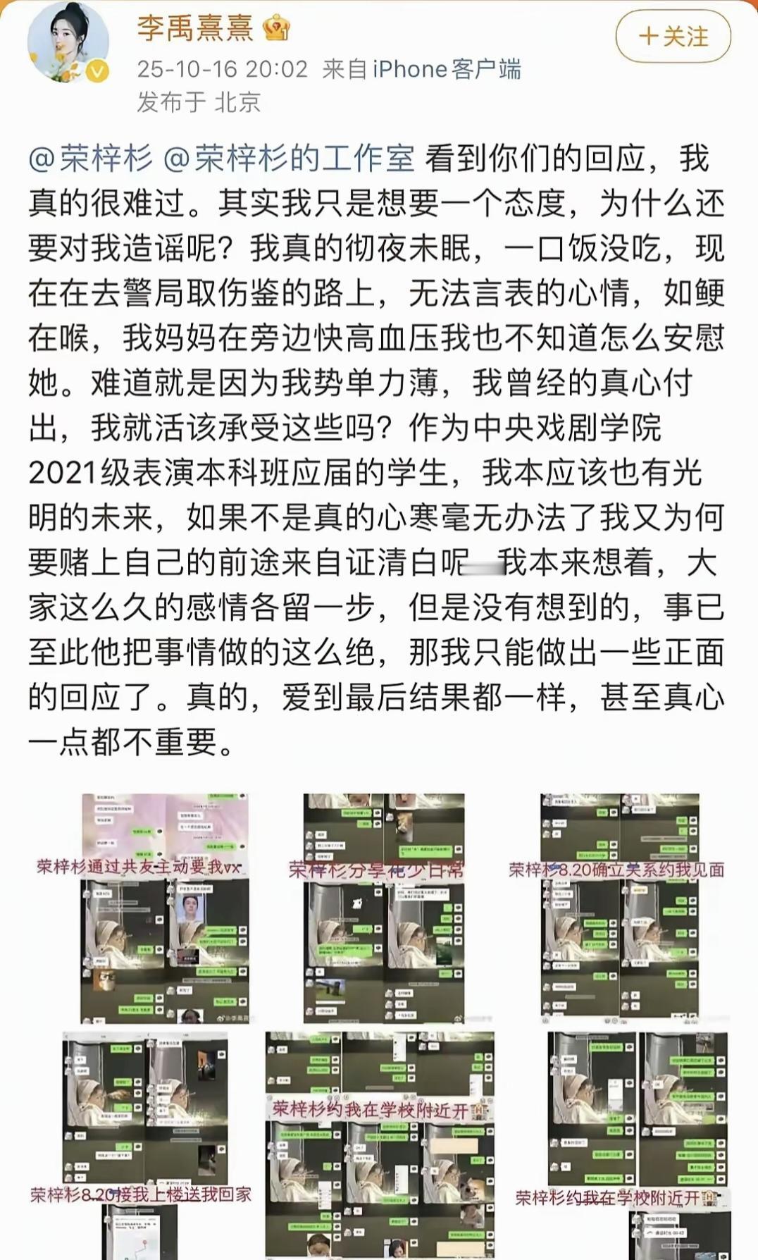 明星也嫌700元开房费用贵? 近日,演员荣梓杉因情感纠纷引发关注。先是当事人李禹熹熹公开控诉,随后海淀公安分局发布的警情通报,10月8日,23岁的她被19岁的他殴打、拖拽、伤害。经伤情鉴定,二人均不构成轻微伤。目前,案件还在调查处理中。 从女方发出来的聊天截图看,小小年纪开房,明星也嫌700元开房费用贵,并吆喝着aa。不讲武德啊,果然女孩有个恋爱脑容易受伤害啊,从情感到身体。真是看不懂这一代年轻人,女孩图啥啊自毁前途,男的也要为自己的少年轻狂时付出代价!大家觉得事件会不会随着发酵再有反转?