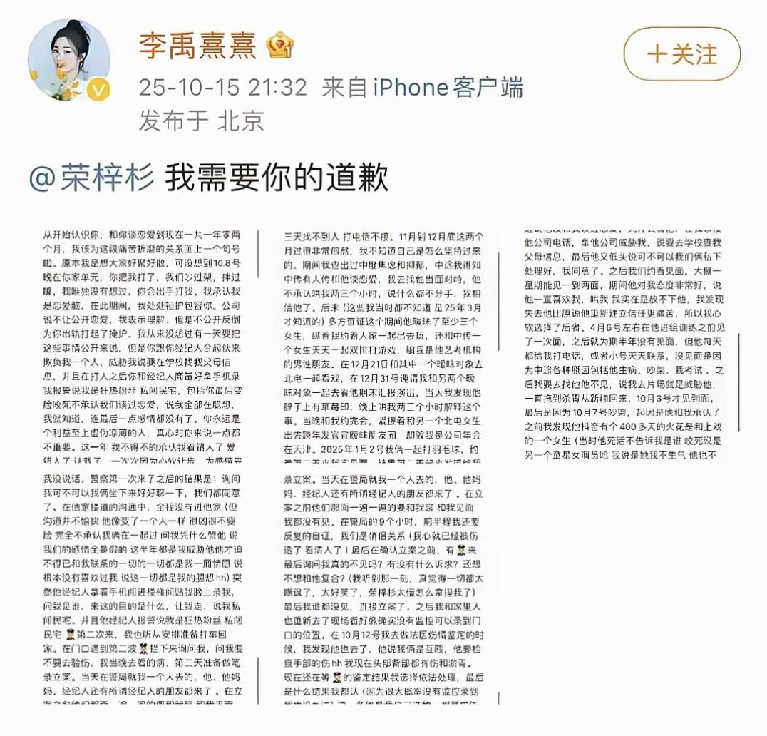 明星也嫌700元开房费用贵? 近日,演员荣梓杉因情感纠纷引发关注。先是当事人李禹