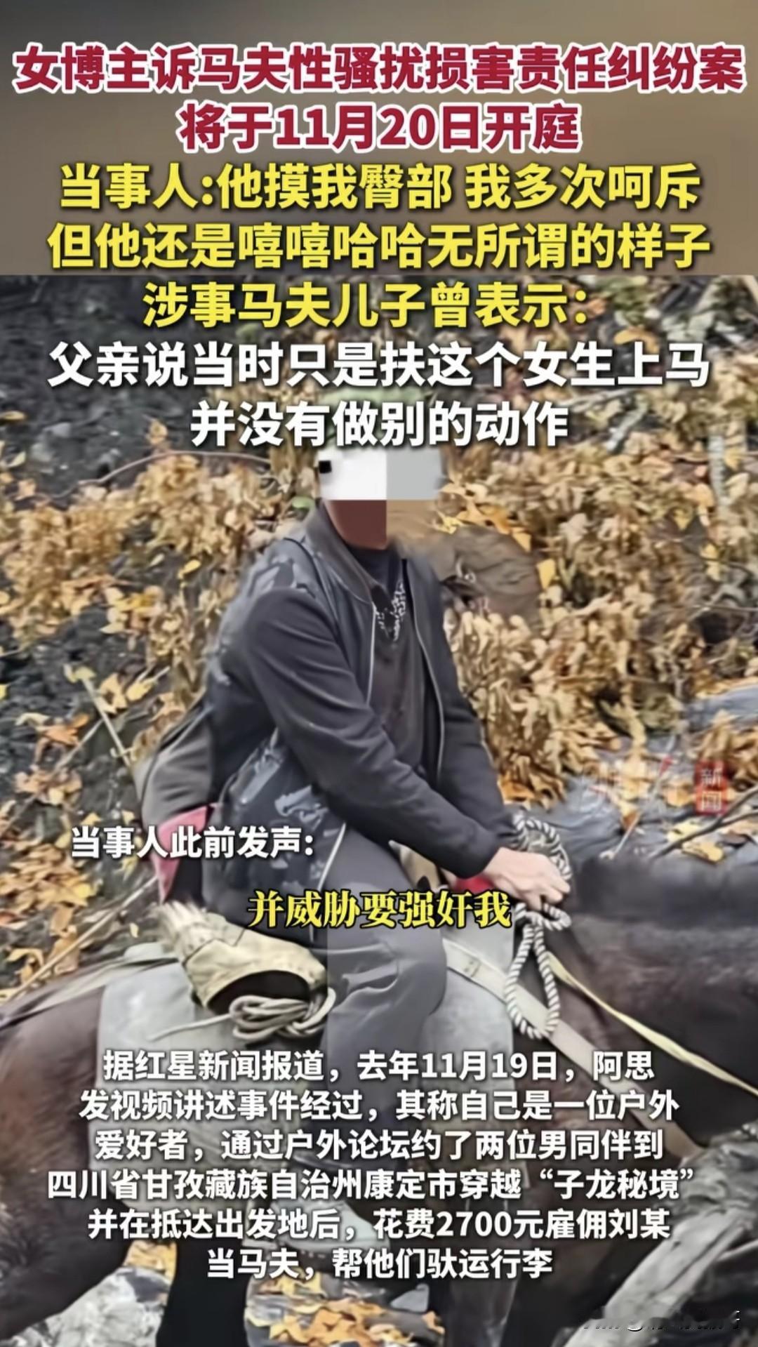 去年11月,女驴友阿思通过论坛约两名男伴去川西徒步,期间还花2700元雇了个马夫驮行李。据她描述,徒步第二天马夫就有摸其臀部的动作,呵斥也没用。第四天更过分,趁她疲惫骚扰还威胁强奸,还好有过路驴友经过才脱险。后来阿思发视频曝光,马夫儿子却称只是扶她上马的肢体接触。目前已经立案,11月20日开庭,到底真相是什么,是诬陷还是性骚扰,一切用证据说话。