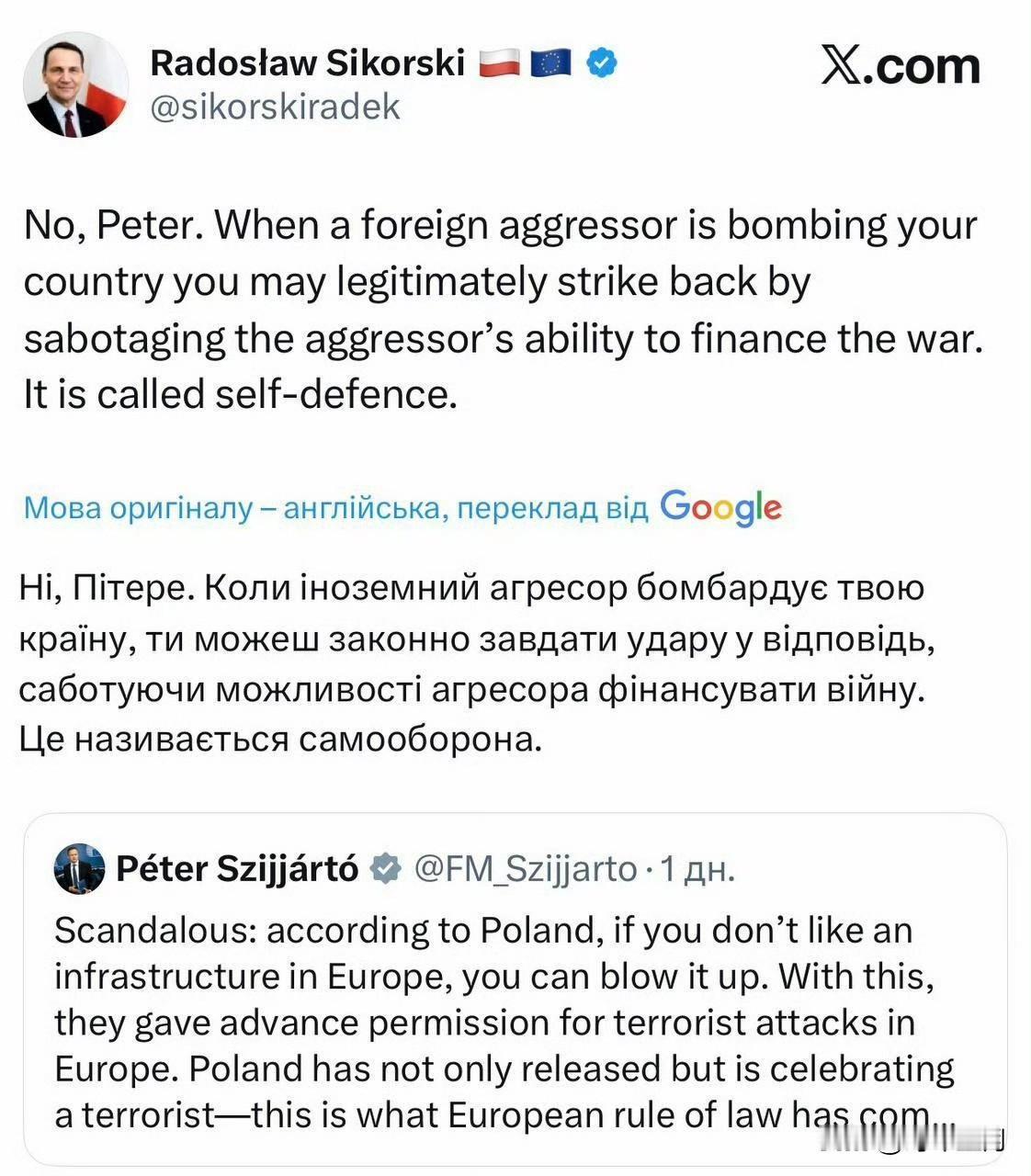 匈牙利外交部长西雅尔托抱怨波兰拒绝引渡涉嫌破坏“北溪”管道的嫌疑人。他说:波兰认为,如果你不喜欢欧洲的某些基础设施,你可以炸毁它们。他们这实际上是对欧洲恐怖袭击的事先许可。波兰不仅释放了恐怖分子,还支持他——这就是欧洲法治的现状,”西雅尔托愤怒地说。 他没有解释为什么匈牙利支持俄罗斯恐怖分子,积极讨好他并且仍然留在欧盟。波兰外交部长拉多斯瓦夫·西科尔斯基回应了他的歇斯底里。 “不是的,彼得。当外国侵略者轰炸你的国家时,你有合法权利进行反击,破坏侵略者资助战争的能力,”西科尔斯基强调道。