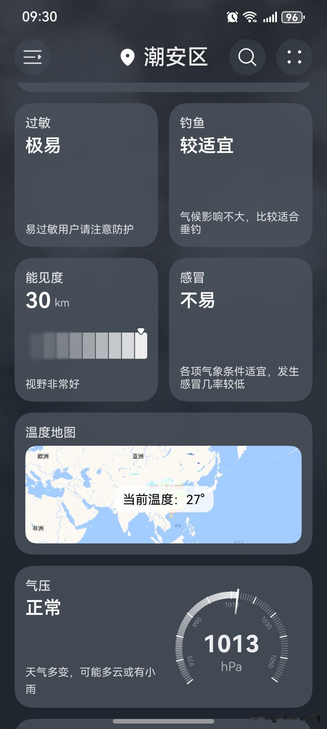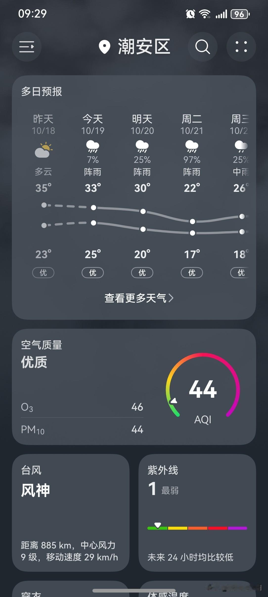 冷空气将影响东部地区, 未来3天各地气温将刷新下半年新低, 黑龙江部分地区迎小到中雪, 最大温差超10℃! 南方多地加入降温行列,冷空气持续影响我国。 台风“风神”将进入南海, 风暴潮和海浪双黄色预警! 19日起广东冷空气体验装上线, 台风"风神"19日傍晚前后将进入南海, 强度逐渐增强。 今天(19日)粤北部分市县凉意十足, 我省大部依旧热晴高唱。 受台风和冷空气共同影响, 19~22日我省海陆风力加大, 部分市县气温自北向南逐渐下降, 过程降温幅度约6~10℃。 今天(19日), 潮州阵雨转多云, 气温25~33℃, 此刻气温27℃, 体感温度29℃。 虽说广东今天开始气温下降, 但冷空气还没到达潮州, 今天还是很热呢! 希望明天能凉快一点吧!