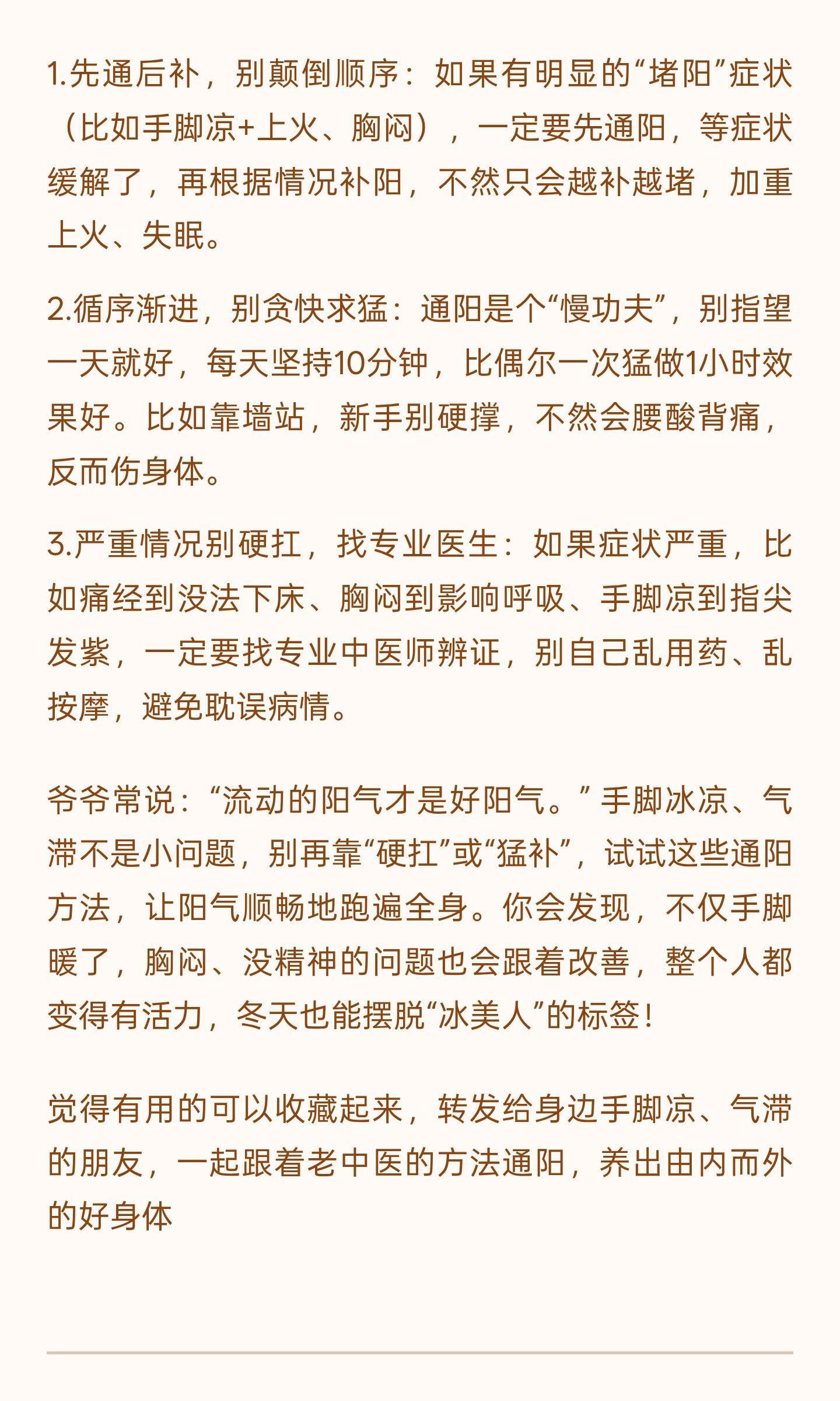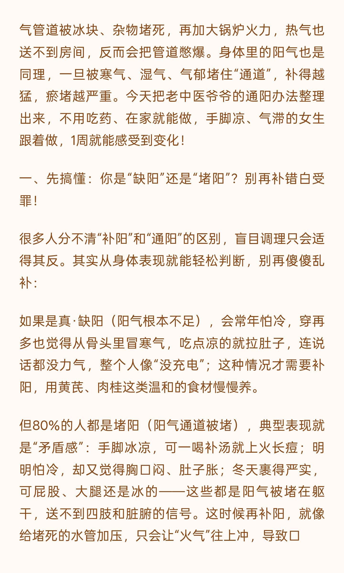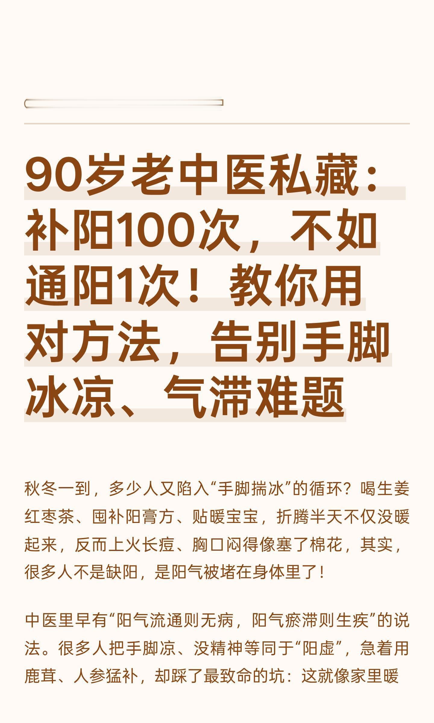 90岁老中医私藏:补阳100次,不如通阳1次!手脚冰凉、胸闷气滞是阳气被堵的表现,盲目补阳会适得其反。通过经络疏通、自然通阳和调整生活习惯,1周内可改善症状。先通后补,循序渐进,避免贪快求猛。健康养生