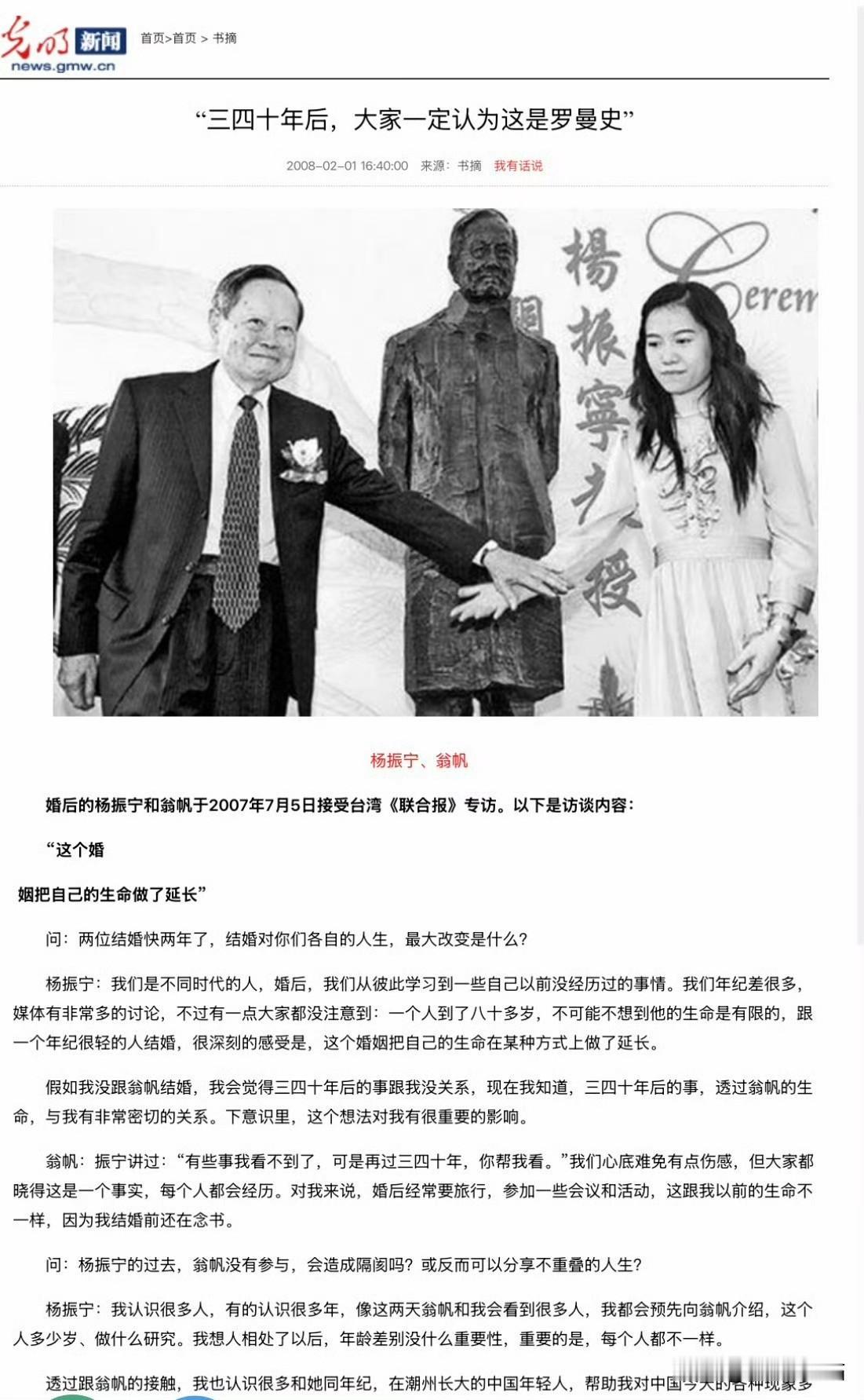 杨振宁在物理界的历史地位相当于足坛的谁?如果说牛顿是贝利,爱因斯坦是马拉多纳,那么杨振宁可以说是C罗梅西这一级别的,保守说也是坐5望3的人物。当然,与伟大的物理相比,足球又算什么呢? 霍金或许知名度更高,但说实话,在物理界,霍金大概就是武磊,而杨振宁是梅罗。 当然,很多人的争议无非是那段爱情。 翁帆在纪念杨振宁的文字里,写下了这样一句话,有他多年的陪伴,我何其有幸,翁帆这里所说的多年,其实是21年,2004年,当28岁的翁帆和82岁的杨振宁结婚时,舆论哗然,当时有多少人,相信这段婚姻会幸福的持续21年呢,当时人们最大的疑惑就是,翁帆为什么会嫁给杨振宁,在有一期的杨澜访谈录里,翁帆回答了这个问题,“其实你不觉得就是一个女人,假如她崇拜一个男人的话,然后假如这个男人又喜欢她或爱她,其实她很容易爱上这个男人的对不对?” 这就是爱情的力量,翁帆顶着巨大的舆论压力选择嫁给杨振宁,更是对他照顾有加,关怀备至,其实杨振宁自己也知道世人对这段婚姻的态度,对此他是这样说的,“我们多见了几次以后,就彼此更多了认识,大家觉得像这样子的,有这么大的年龄差的婚姻,是一定不能成功,翁帆跟我都知道,不会出问题。” 汪帆今天在文章里还翻译了一首杨振宁生前写下的诗,里面有一句是:幸福圆满的一生,无怨无悔,深深的感恩,翁帆最后写道,是的,他的一生是有责任,有担当,有幸福,有感恩的一生,每当夜晚我们仰望星空时,杨先生会在其中的一颗星星上,面对着我们微笑。杨振宁 杨振宁,翁帆 梅西