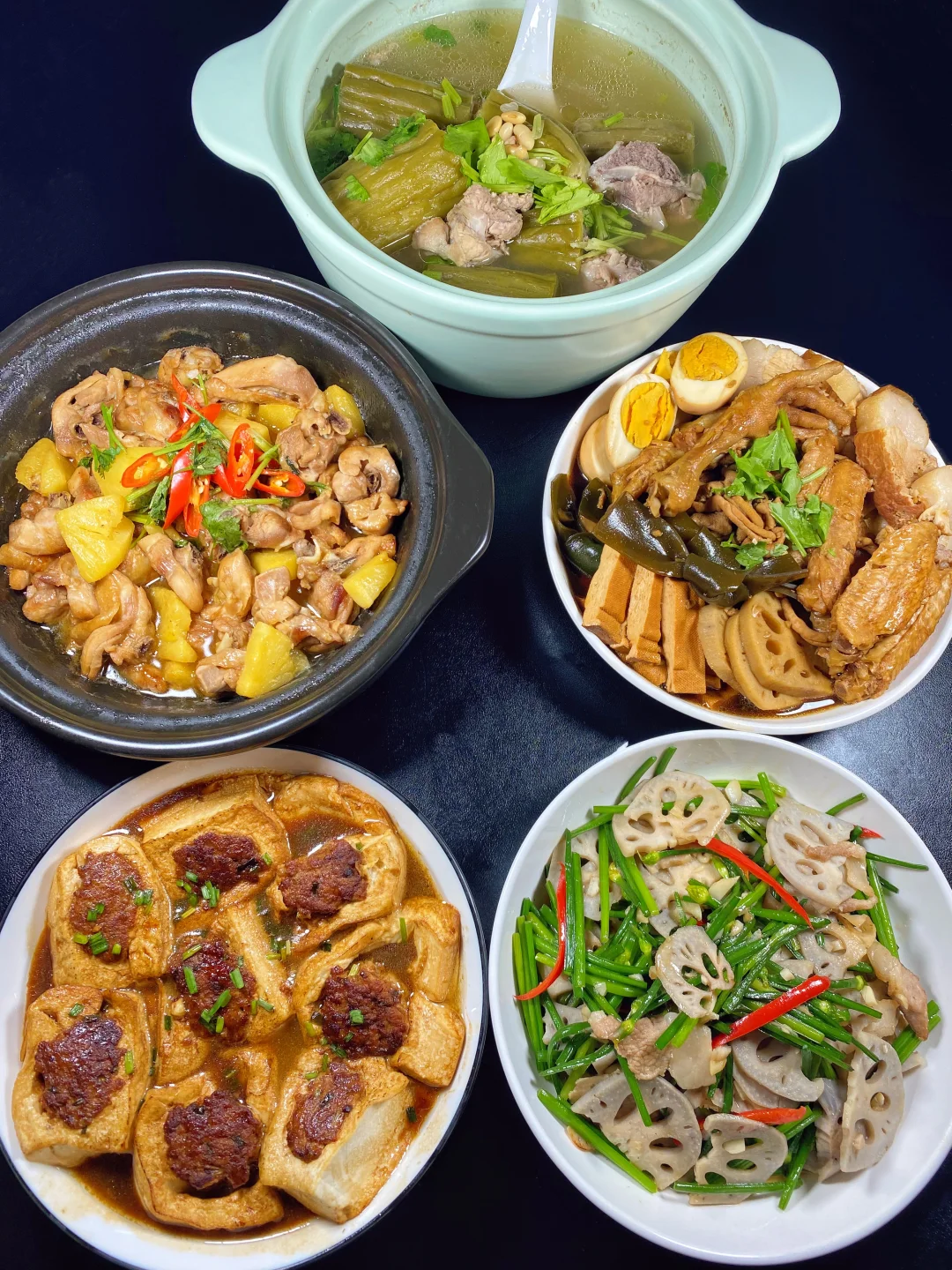 卤水拼盘+客家酿豆腐+五花肉藕片炒韭菜花+黄豆苦瓜酿肉猪骨汤+砂锅菠萝🐔