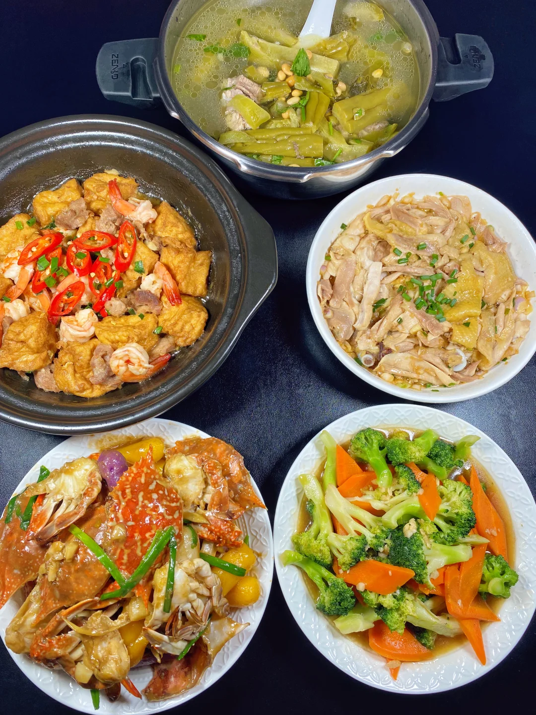 葱油手撕鸡+螃蟹炒年糕+虾仁肉片豆腐煲+苦瓜酸菜猪骨汤+蒜蓉西兰花胡萝卜