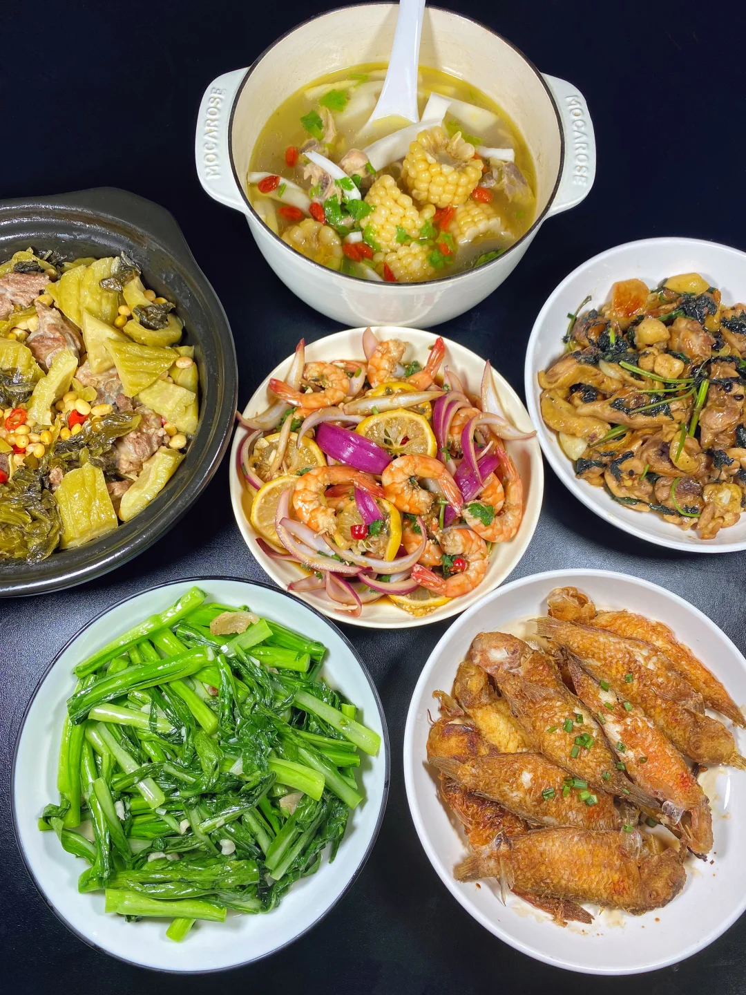 酸辣柠檬虾+豆豉紫苏煎焗鸡+酸菜苦瓜排骨煲+香蕉鹦哥鱼+猪油渣炒菜心