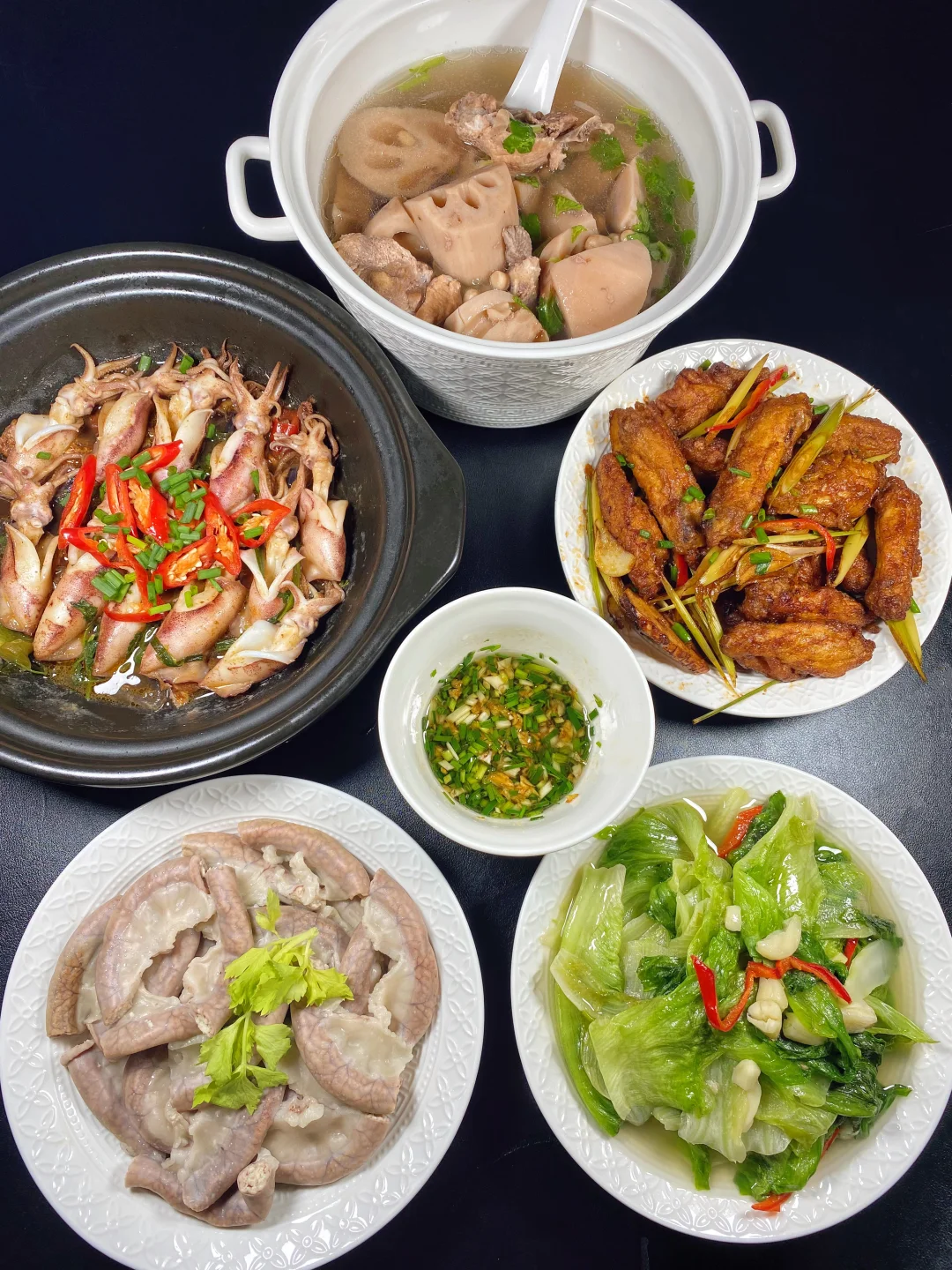 香茅鸡翅+白灼粉肠+沙姜焗小管+莲藕花生猪骨汤+蒜蓉生菜