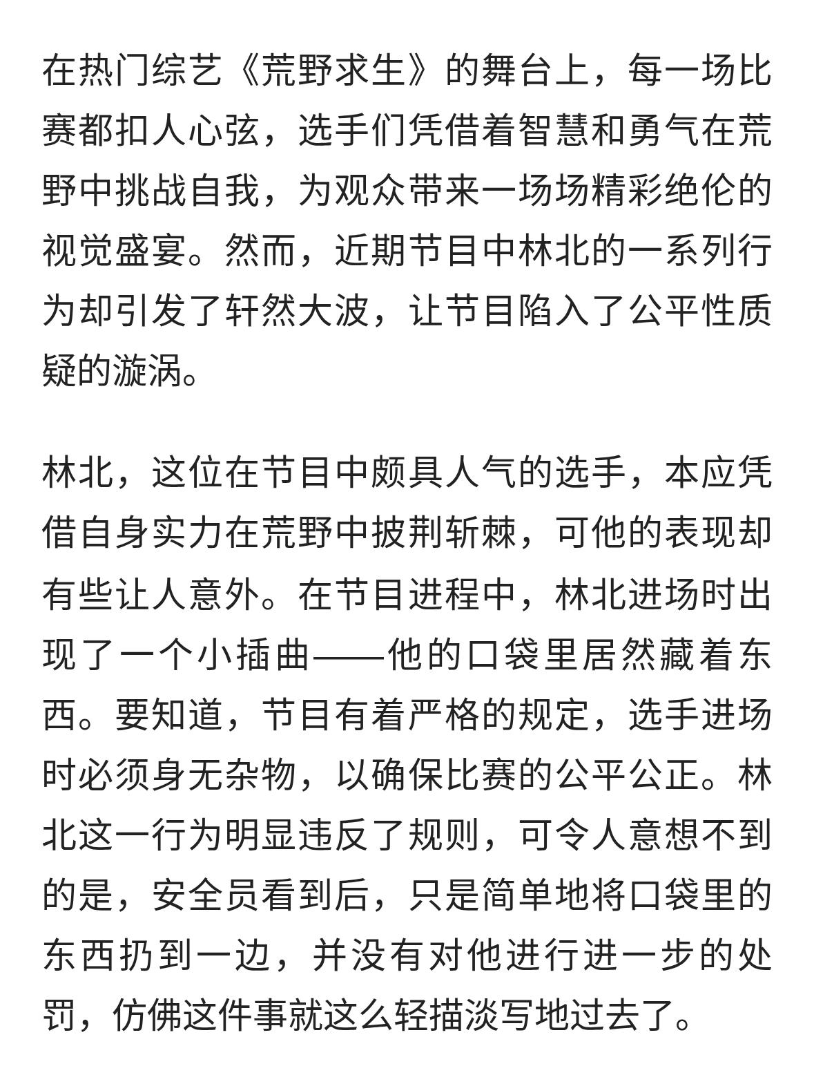 荒野求生风波:林北违规引争议,公平性何在?