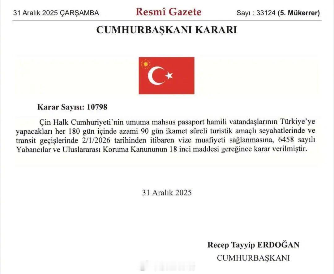 【土耳其1月2日起对中国公民免签】当地时间2025年12月31日,土耳其《官方公报》发布总统令,宣布自2026年1月2日起,对持中国普通护照的公民实行免签入境政策。