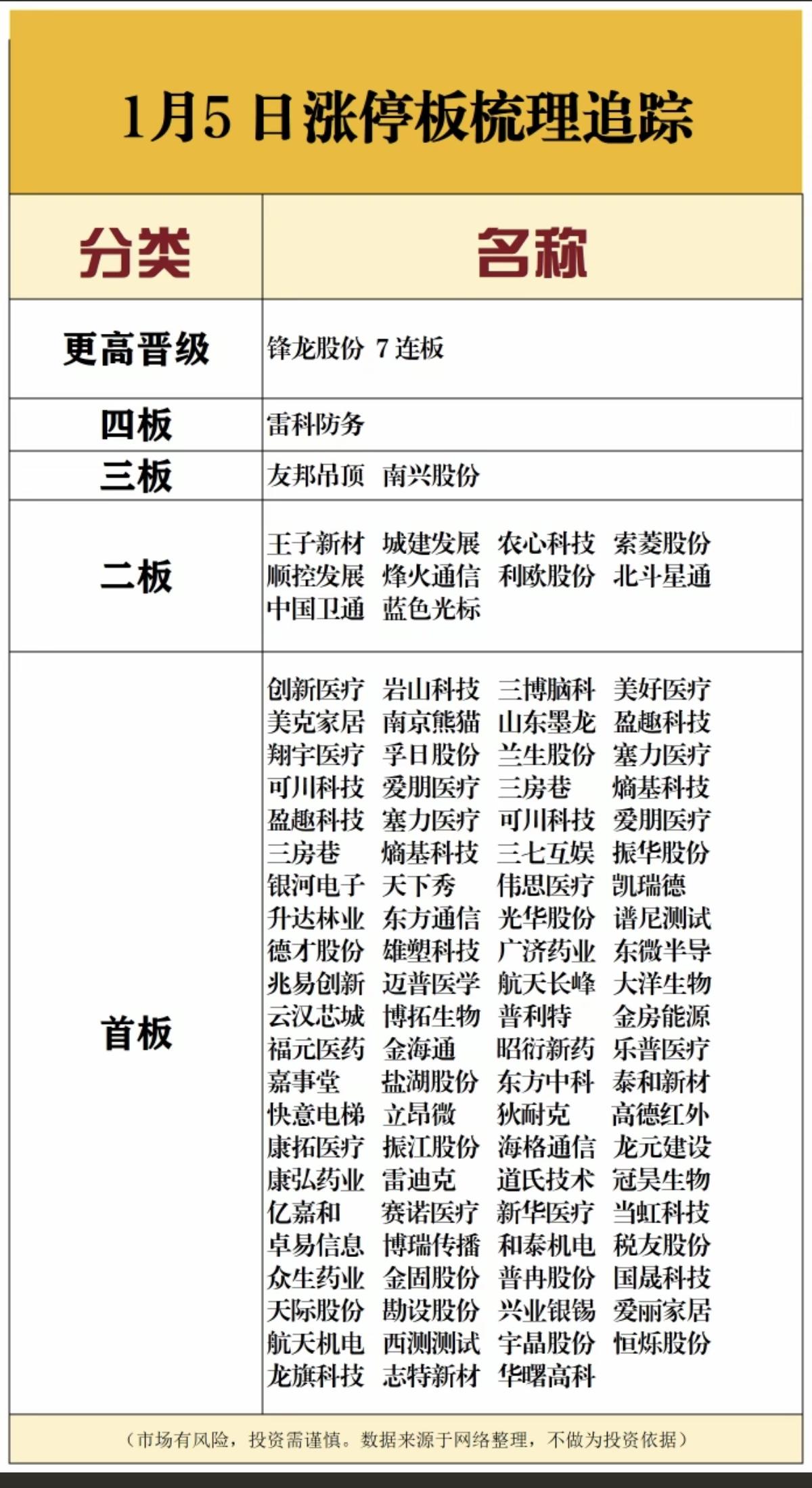 1.5周一 涨停板股票:连板高度! 7连板 锋龙股份 4连板 雷科防务 3连板 友邦吊顶 南兴股份