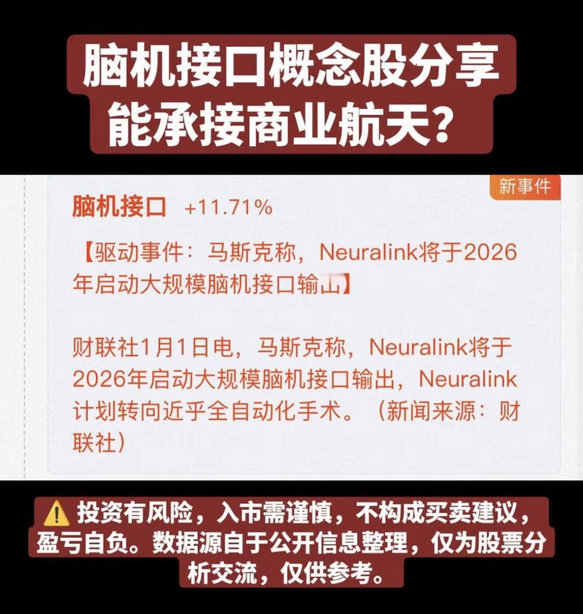 “脑机接口”接棒“商业航天”,20股涨停! 马斯克的影响力太牛了!12月份推动商业航天,1月份推出“脑机接口”,“人脑工程”,满屏都是涨停! 脑机接口核心龙头股: