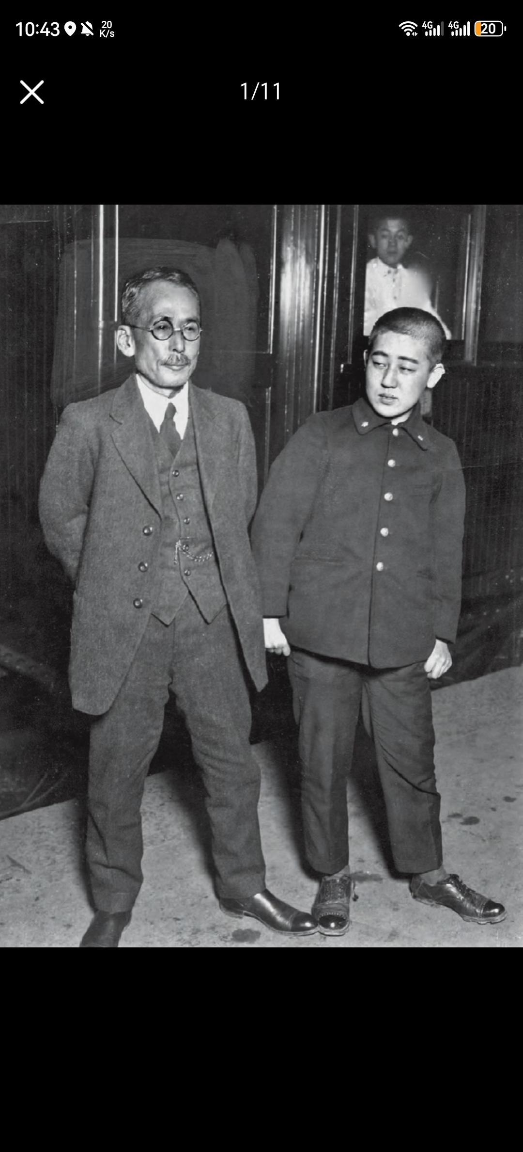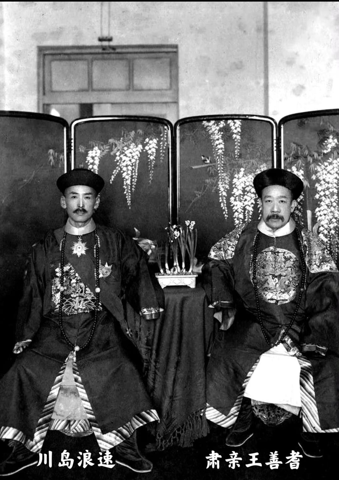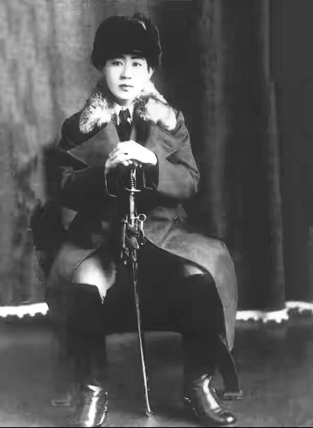 满清格格与她的养父合照。这是理着平头的川岛芳子和她的日本养父川岛浪速。可以看到她一身男装,两手插兜而立,其貌不扬,与"间谍之花"颇有出入。