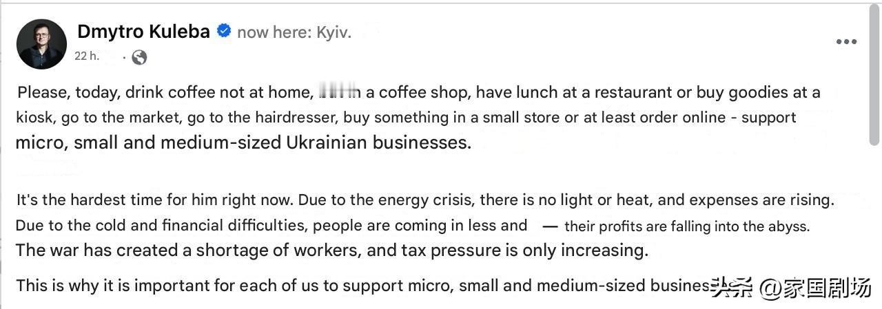 乌克兰前外交部长库列巴敦促乌克兰民众,在停电期间外出就餐,以支持餐饮业: “今天,请不要在家喝咖啡,而是去咖啡馆喝;去餐厅吃午饭,或者在小卖部买些好吃的;去市场逛逛;去理发店剪个头发;去小商店买点东西;或者至少在网上订购一些东西。”