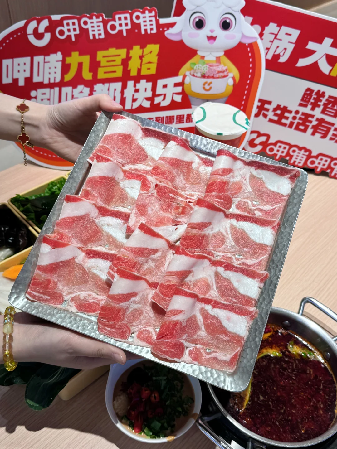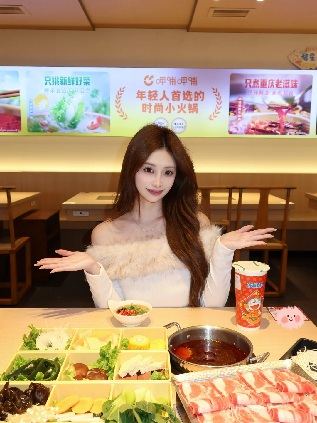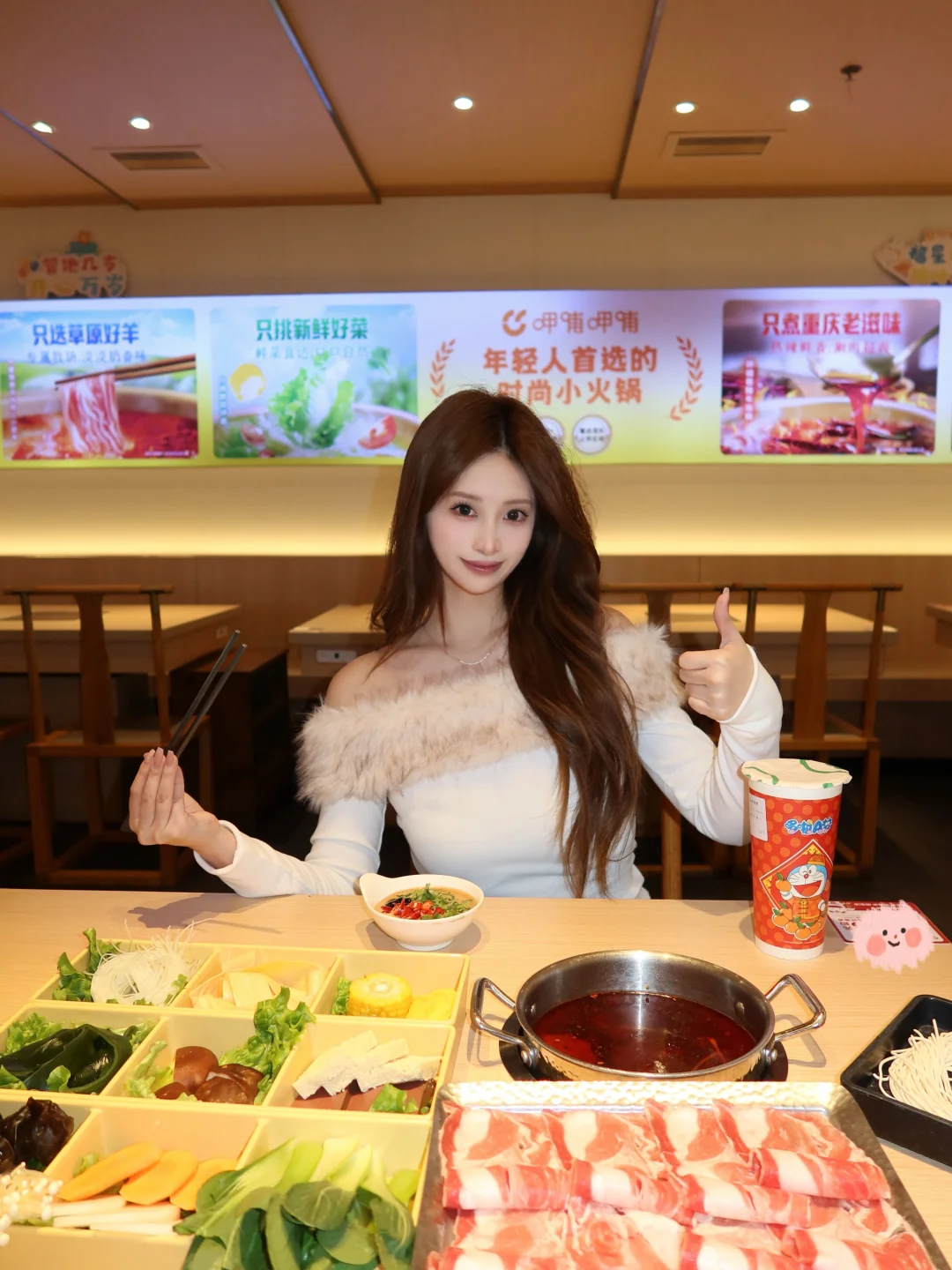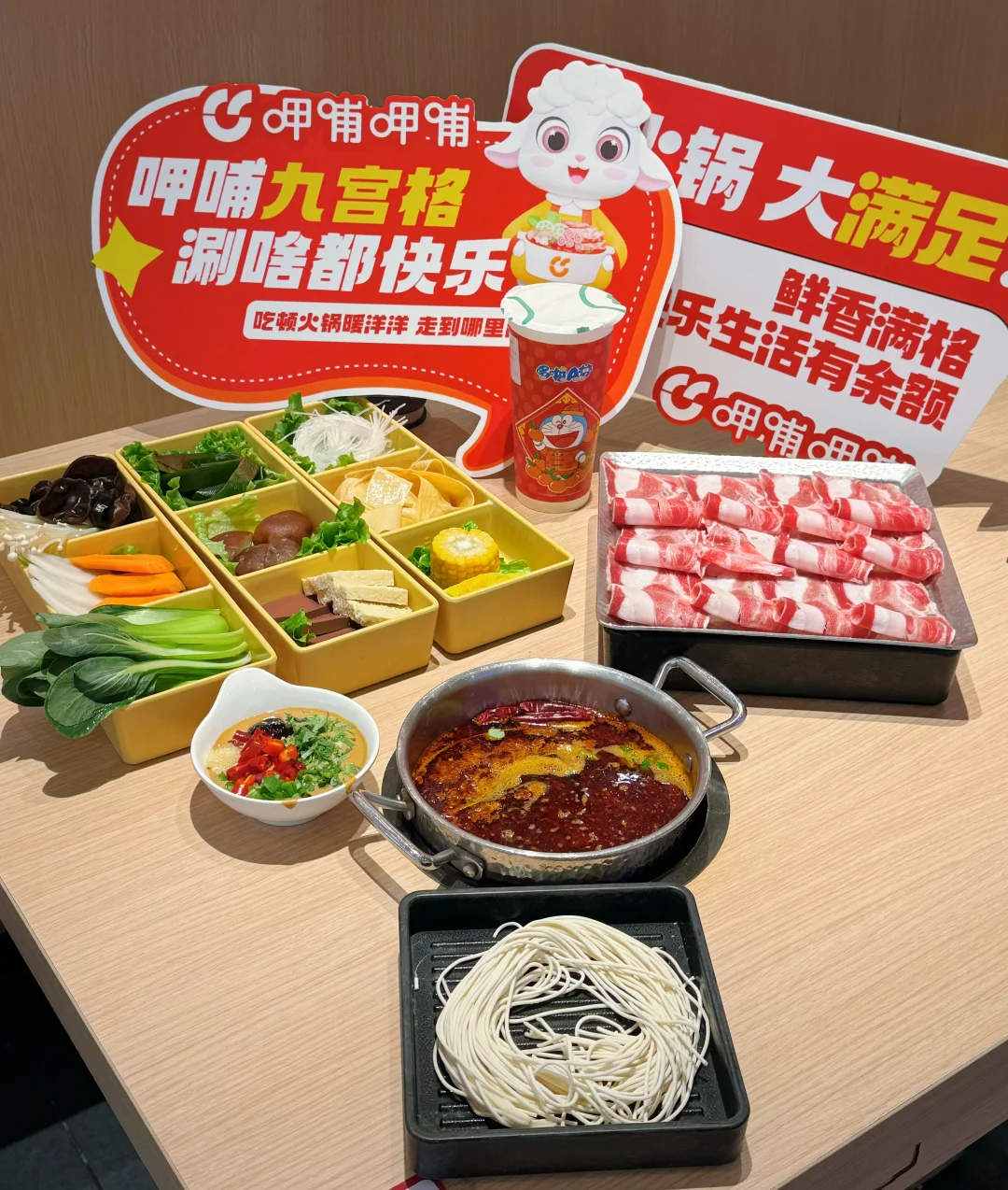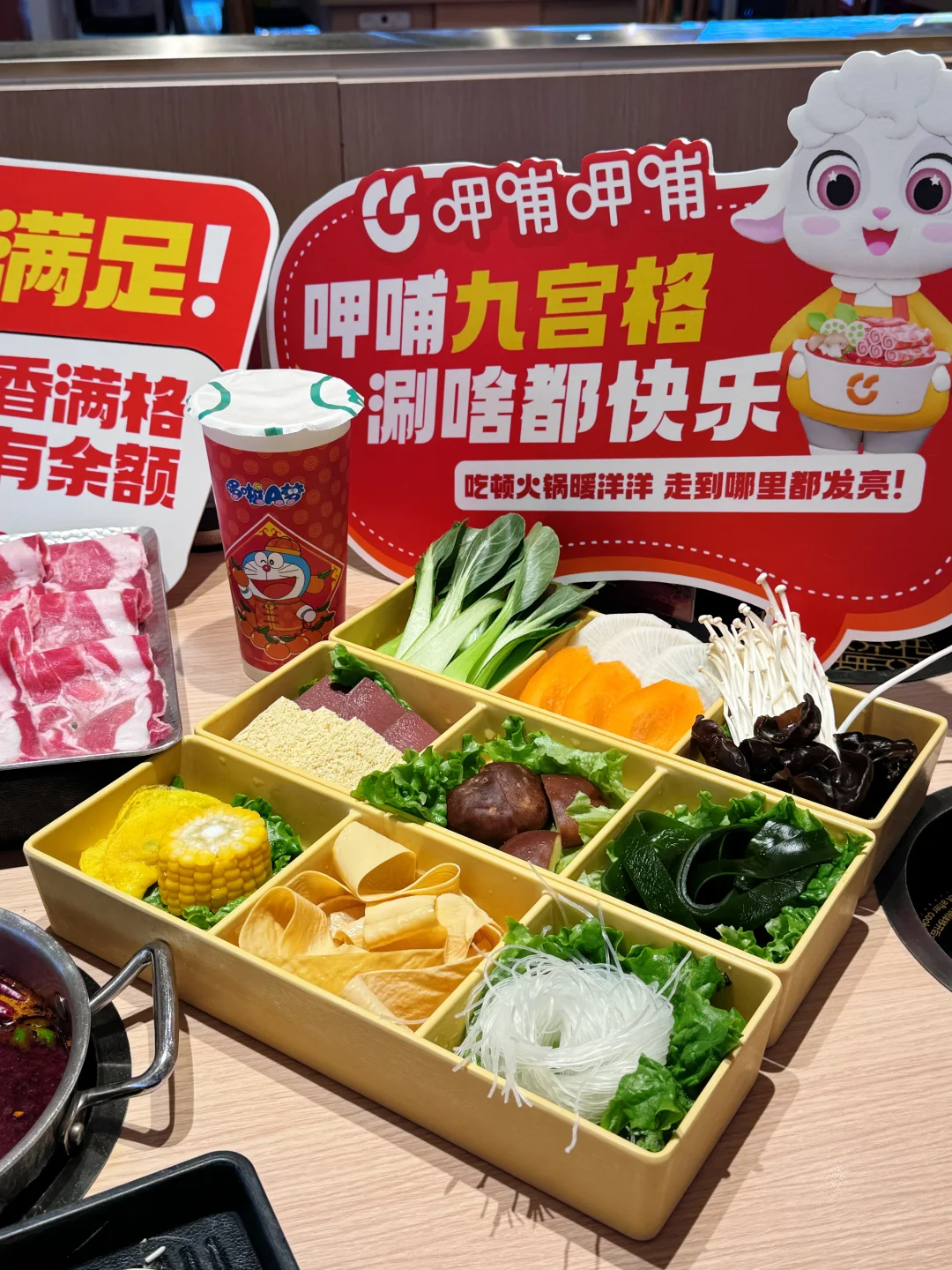 天冷了,没事就想来吃呷哺呷哺,结果发现他们上新品了!!! 直接被新出的这个九宫格拼盘拿捏了🤏🏻 简直太懂我们火锅🍲脑袋了 可以尝到多种菜品,荤素丸滑、主食甜品统统拿下~ 每次点菜和我一样很纠结的家人们闭眼冲!! 我点的 内蒙草原乌珠穆沁小肥羊套餐 这羊肉真的很绝🐏 肥瘦相间,口感很好 入口还有有一股淡淡的奶香味~ 吃完辣辣的火锅🍲 再来一杯茶米茶🥤解腻 而且还是哆啦A梦联名杯! 蓝胖子的杯身好萌阿~ 甜度刚好,麻辣和清甜撞个满怀! 这个冬天❄️的快乐是呷哺呷哺给的!