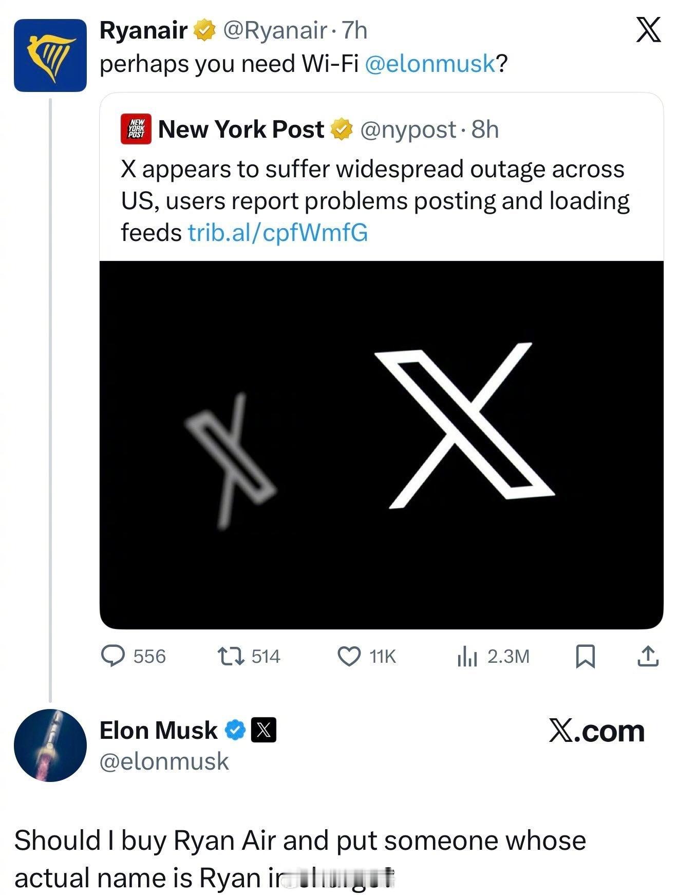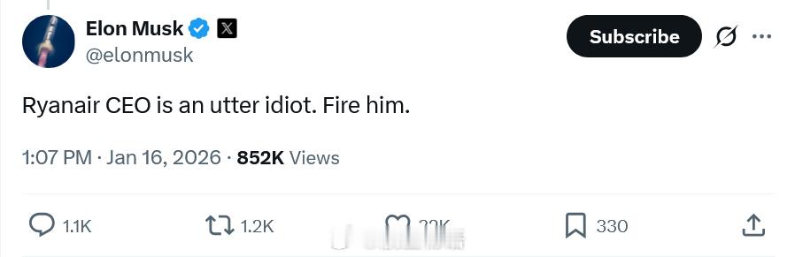 马斯克与瑞安航空CEO在网络上就后者拒绝在其机队里安装“星链”设备一事隔空对骂,马斯克在X上直呼“瑞安航空的CEO简直是个蠢货。”一名网友建议马斯克可以直接收购瑞安航空并炒掉CEO,马斯克回复称“好主意”。然后看热闹不嫌事大的网友又请出最近很忙的美国国务卿卢比奥“任命”他为瑞安新任CEO。可是按照最近的网络动态,他的头衔不应该是“瑞安总督”嘛