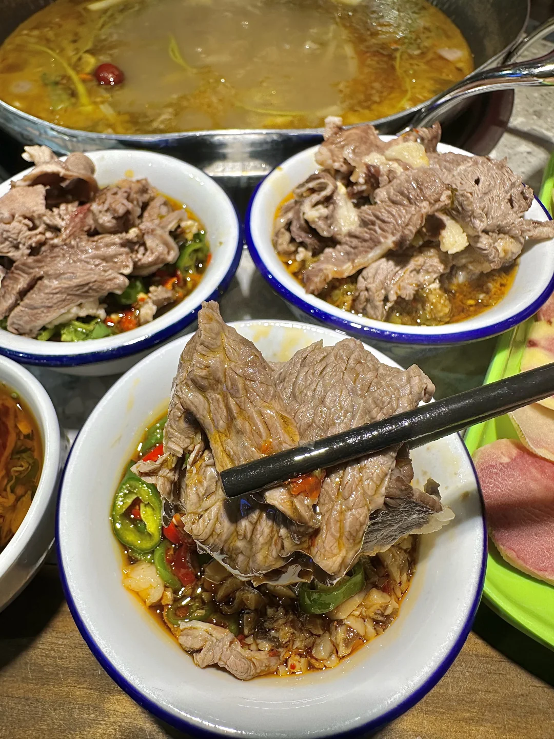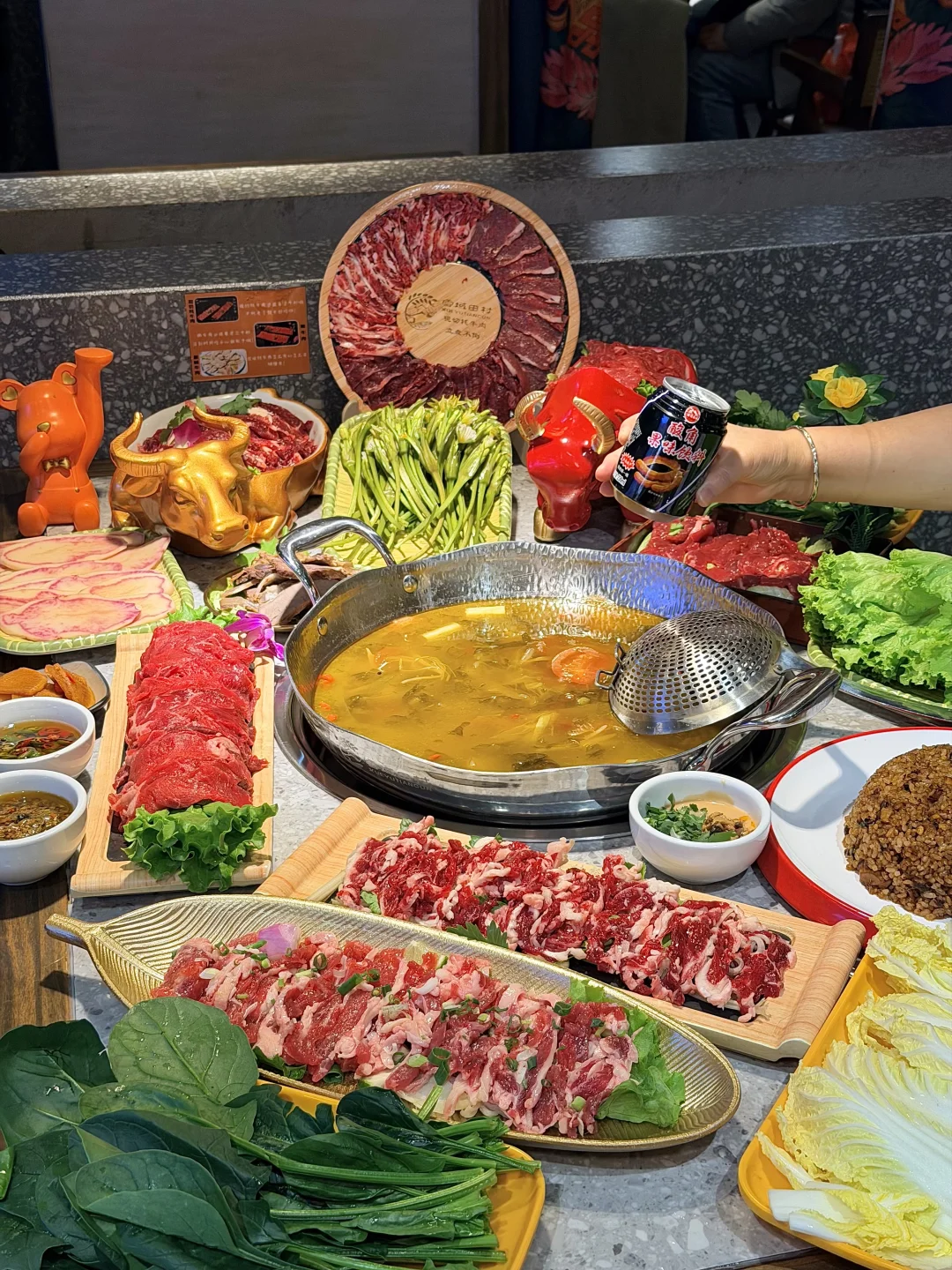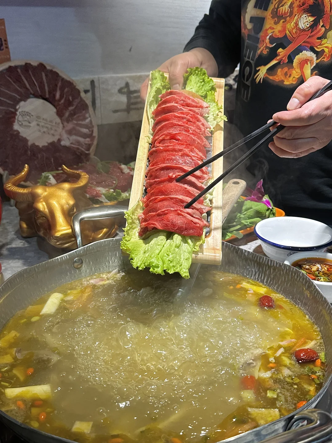 在丽江大水车旁的酸汤牛肉巨好吃。。。。 还是味蕾和视觉双重满足的那种。。。 晚上还有民族歌舞表演敲有feel, 店员和游客一起打跳,烟火气直接拉满,完全融入丽江夜晚的氛围。酸汤牦牛肉尊嘟吼吼次!涮进够味的酸汤里,嫩到弹牙,酸香裹着肉香越嚼越上头。。。 锅底越煮越浓,不管涮什么都够味,调料种类也多,连配菜都被赋予了新灵魂。。。。 建议错开饭点但别太晚,既能少排队,又能完整看完表演,夜宵这么吃也是惬意了~