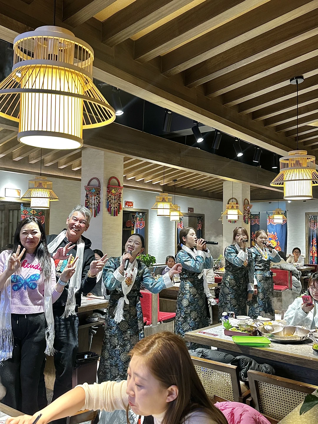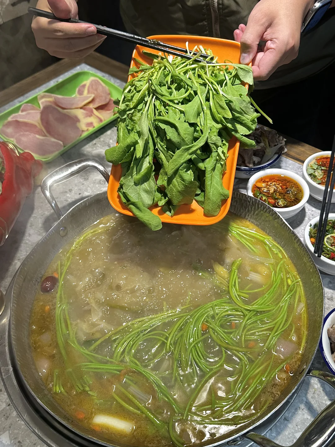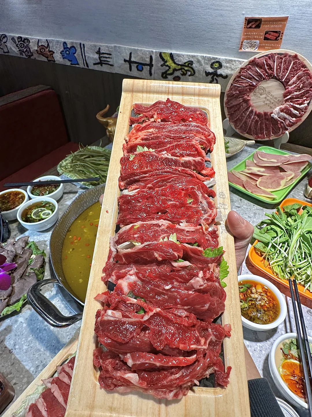 在丽江大水车旁的酸汤牛肉巨好吃。。。。 还是味蕾和视觉双重满足的那种。。。 晚上还有民族歌舞表演敲有feel, 店员和游客一起打跳,烟火气直接拉满,完全融入丽江夜晚的氛围。酸汤牦牛肉尊嘟吼吼次!涮进够味的酸汤里,嫩到弹牙,酸香裹着肉香越嚼越上头。。。 锅底越煮越浓,不管涮什么都够味,调料种类也多,连配菜都被赋予了新灵魂。。。。 建议错开饭点但别太晚,既能少排队,又能完整看完表演,夜宵这么吃也是惬意了~