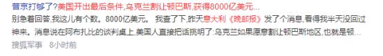 普京打够了?美国开出最后条件:乌克兰割让顿巴斯,获得8000亿美元。意大利《晚邮报》报道,在俄美乌三国阿布扎比谈判上,美国准备要求8000亿美元交换顿巴斯地区。 这8000亿美元不是白给的,顿巴斯也不是随便一块地。美国说的这8000亿,约合5.58万亿人民币,看着是笔天文数字,能帮乌克兰修修被炸的房子、恢复产业,但里面全是门道。 这笔钱不是纯粹的援助,是公共资本加私人投资凑的,欧盟要出1000亿欧元,剩下的主要靠美国动员私人资本进来。说白了,这些钱要靠乌克兰未来的矿产收益、基建红利慢慢还,美国的大企业还能趁机掌控乌克兰的矿产、能源这些核心产业,等于拿乌克兰的未来当抵押。 再看顿巴斯,这可不是普通的地盘,是俄罗斯发动特别军事行动的核心目标。从2014年乌东局势紧张开始,这片地方就一直是俄乌博弈的焦点,现在冲突快四年了,俄军已经掌控了顿巴斯的绝大部分区域。 卢甘斯克差不多99%的地方都在俄军手里,顿涅茨克也占了七成以上,乌军只剩斯拉维扬斯克-克拉马托尔斯克这一小块城市群还在守,控制范围就几千平方公里。 而且俄军现在已经三面围住了斯拉维扬斯克,前锋离市区就30公里,还把乌军的补给线全切断了,乌军想送弹药、粮食进去都难,战场优势一直攥在俄军手里。 美国为啥突然抛出这么个条件?根本不是想真心促成和平,是自己想从俄乌冲突的泥潭里抽身。这几年美国给乌克兰援助不少,国内早就有了厌战情绪,援乌也开始变得拖拖拉拉,欧洲盟友更是各自有心思,援乌的一致性越来越差。 美国想赶紧把俄乌的事理顺,好集中精力对付其他对手。所以才想拿这8000亿当诱饵,让乌克兰割地,既给了自己一个“促和”的政绩,又能把乌克兰牢牢绑在自己这边,后续还能通过资本控制乌克兰的经济,一举多得。 可美国的算盘打得响,乌克兰这边却不敢接。泽连斯基直接就拒绝了割让顿巴斯,不是他硬气,是实在没法妥协。从民意上看,超过70%的乌克兰民众都反对以土地换和平,74%的人明确不赞成割地。 西部民众反对的比例更是低于2%,就算东部因为打仗厌战情绪重,愿意承认俄占区的也才21%。 泽连斯基是民选总统,要是敢割地,不光会被骂卖国,执政基础都会垮掉,甚至可能被追究违宪责任,因为乌克兰宪法明确规定领土完整不能侵犯,改领土得全民公投,战争状态下又没法合法公投,根本没退路。 更关键的是俄罗斯这边,普京压根没到打够的地步。俄罗斯早就把话说明白了,不解决领土问题,就别想达成长期和平协议,让乌军撤出顿巴斯是俄方的重要条件。 现在俄军在顿巴斯稳扎稳打,后勤补给跟得上,士兵士气也足,正一步步压缩乌军的防御空间,没必要在谈判桌上妥协。俄罗斯的想法很实在,谈判桌上拿不到的东西,就靠军事手段拿。 之前俄军还一直在打击乌克兰的能源设施,就是用这种方式施压,根本不会因为美国抛了个8000亿的条件就停下脚步。 这次阿布扎比会谈,虽然是2022年冲突升级以来三方第一次坐在一起,也谈了能源设施保护、战俘交换这些事,还约定从2月1日起,乌克兰主要能源、水利设施周边暂停军事行动两周,让老百姓喘口气,但核心的领土问题还是没谈拢。 各方都没发表联合声明,也没达成实质性共识,顶多就是开启了一个漫长的谈判进程,下周还要继续磋商。 大家别被美国的8000亿骗了,这就是一张远期空头支票。美国之前承诺的不少援助,到最后要么缩水,要么就不了了之。现在战火还没停,这笔钱能不能兑现、什么时候兑现都是未知数。 就算真兑现了,乌克兰也会变成西方资本的经济殖民地,几代人都要还债。而俄罗斯这边,只会按照自己的节奏推进,既然已经掌控了顿巴斯的大部分区域,就不会轻易放手。 美国的这个提议,就是想把乌克兰当成筹码,搞一场带血的利益交换。普京很清楚美国的心思,也握着战场主动权,肯定不会顺着美国的路子来。 乌克兰夹在中间,一边是领土主权和民意压力,一边是美国的资金诱惑和战场困境,左右为难。短期来看,俄乌冲突还结束不了,这场围绕顿巴斯的博弈,还得继续拉锯下去,美国想靠8000亿就搞定一切,根本不现实。