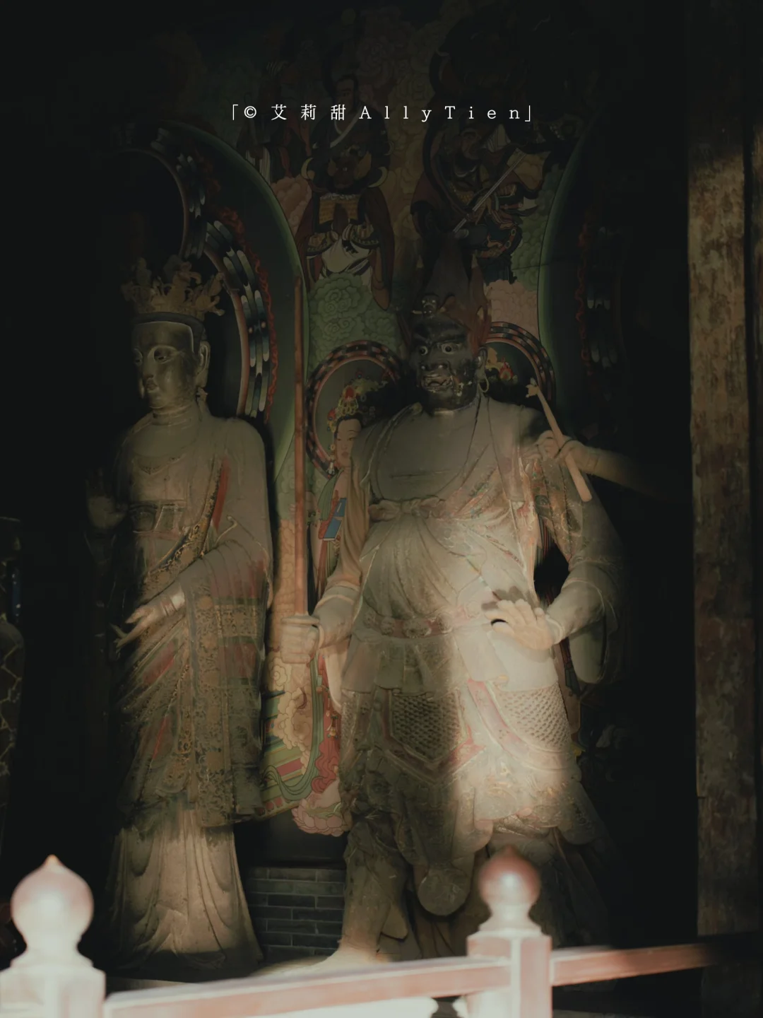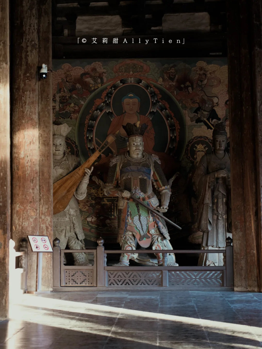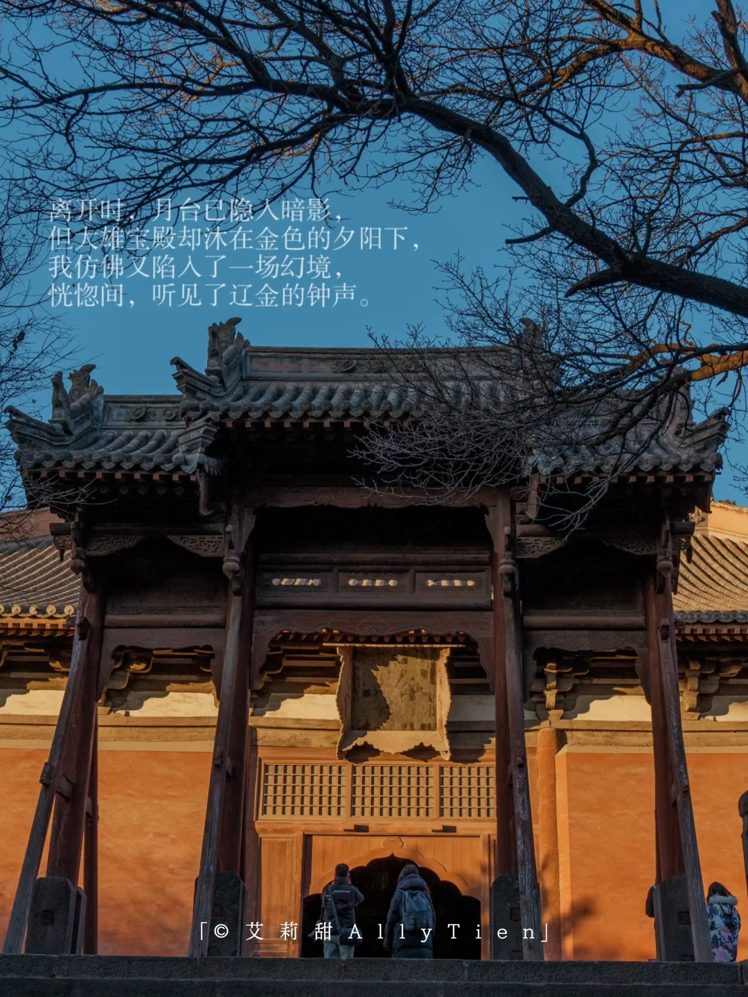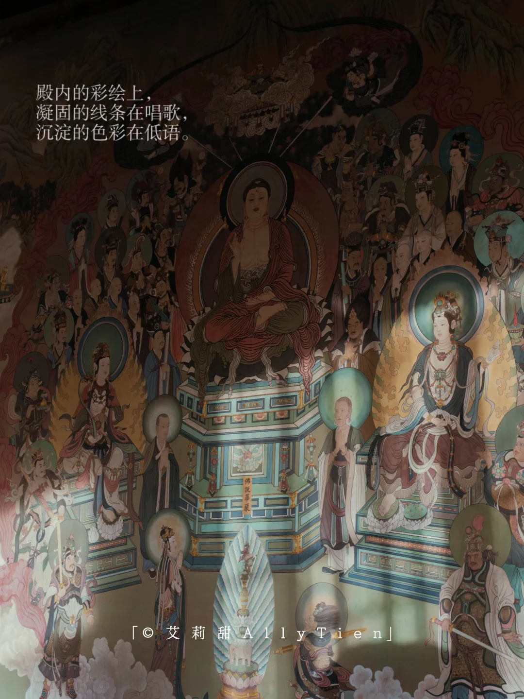 在山西,我总是不经意陷入幻觉。 比如在善化寺, 明明看大雄宝殿外有红色护栏, 走进才发现,那是被殿外红墙“染色”的石栏。 下午4点,冬阳一束束穿过壸门, 昏暗安静的殿内有了光,便有了生机。 看得见五方佛端坐莲台,双目微垂似含远山薄雾。 看得见大吉祥功德天面容平和宁静。 看得见彩绘上,凝固的线条在唱歌,沉淀的色彩在低语。 离开时,月台已隐入暗影, 但大雄宝殿却沐在金色的夕阳下, 我仿佛又陷入了一场幻境, 恍惚间,听见了辽金的钟声。