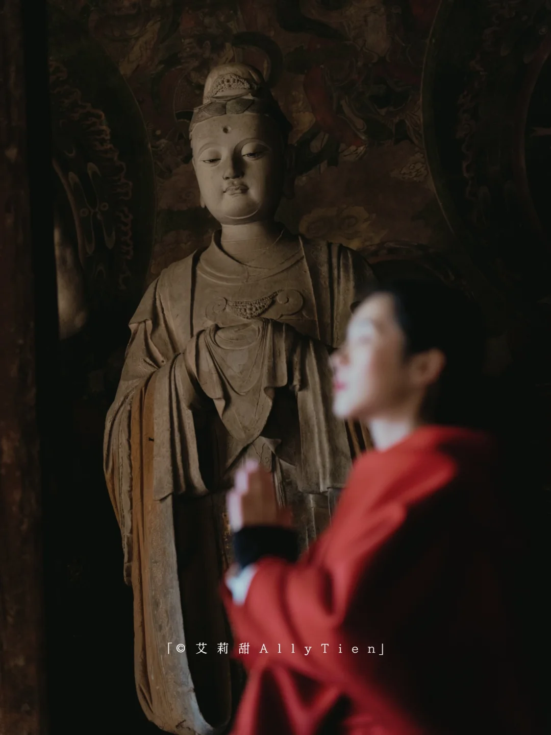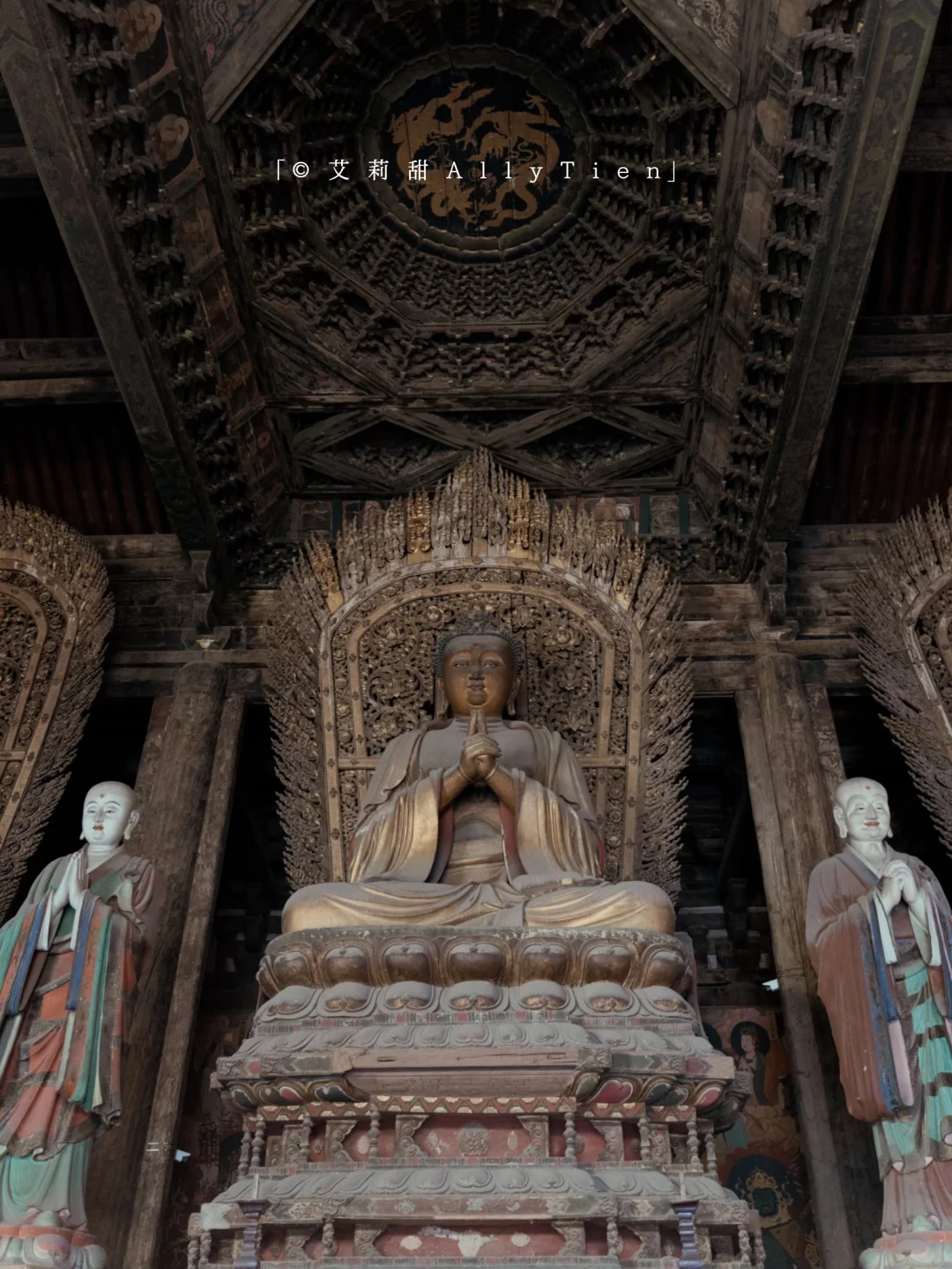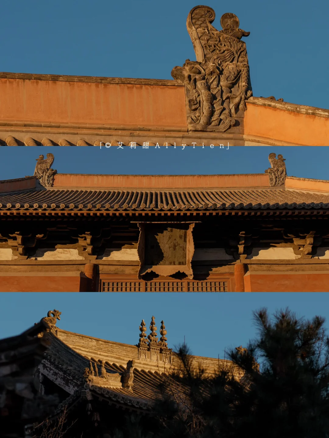 在山西,我总是不经意陷入幻觉。 比如在善化寺, 明明看大雄宝殿外有红色护栏, 走进才发现,那是被殿外红墙“染色”的石栏。 下午4点,冬阳一束束穿过壸门, 昏暗安静的殿内有了光,便有了生机。 看得见五方佛端坐莲台,双目微垂似含远山薄雾。 看得见大吉祥功德天面容平和宁静。 看得见彩绘上,凝固的线条在唱歌,沉淀的色彩在低语。 离开时,月台已隐入暗影, 但大雄宝殿却沐在金色的夕阳下, 我仿佛又陷入了一场幻境, 恍惚间,听见了辽金的钟声。