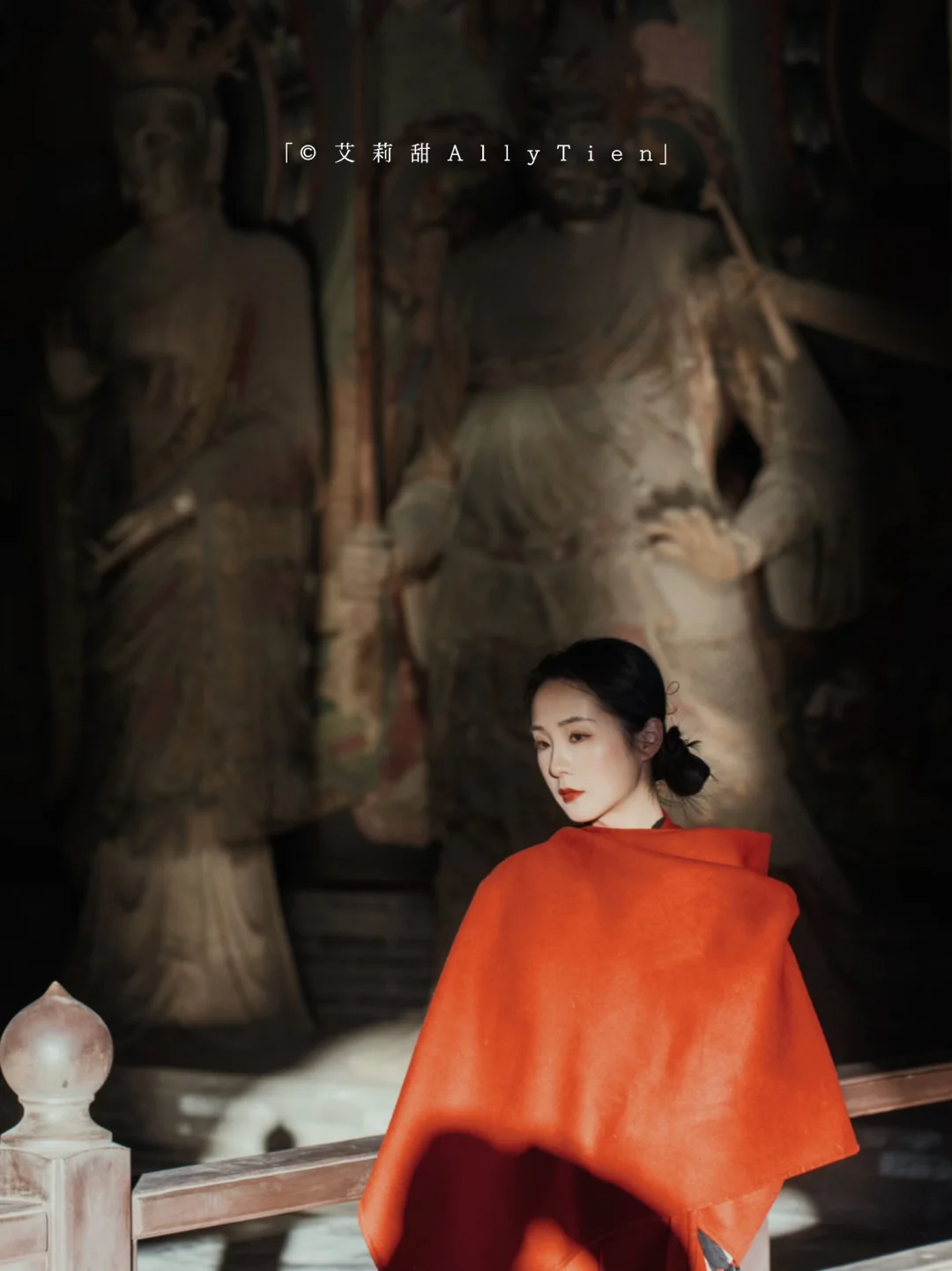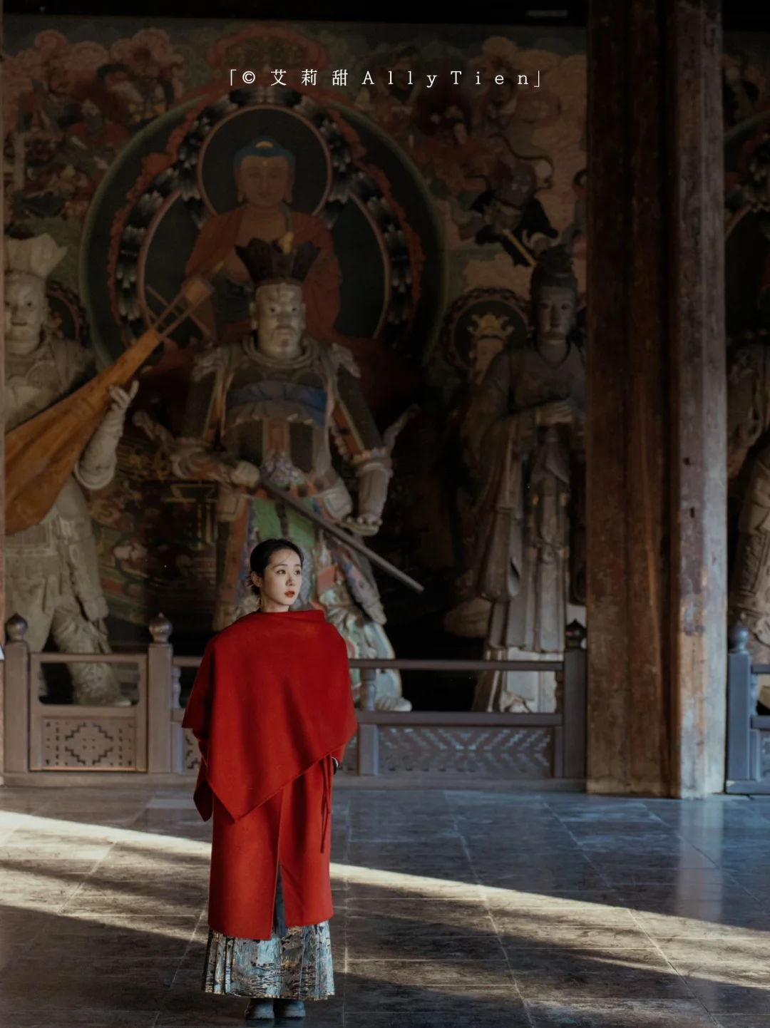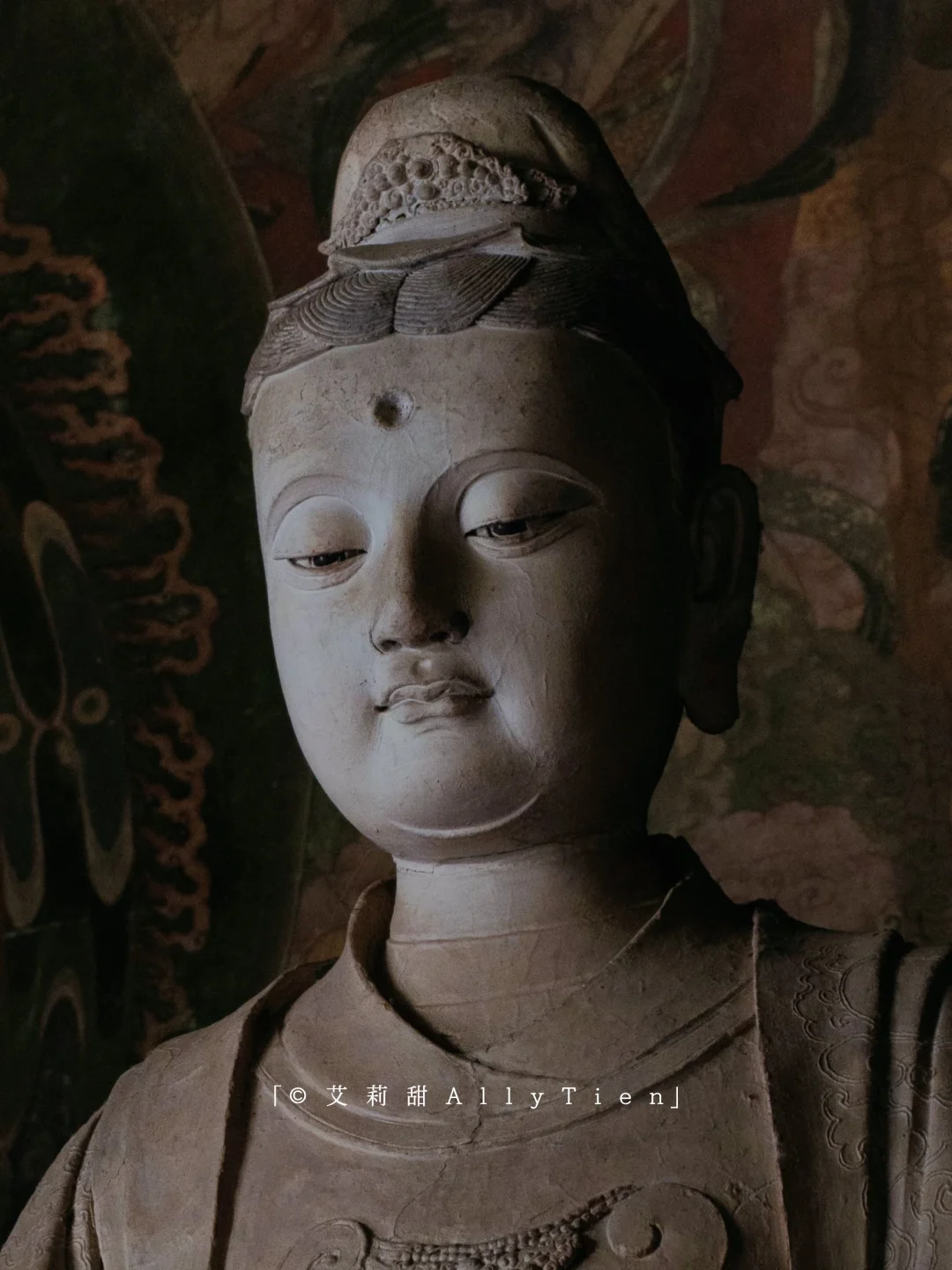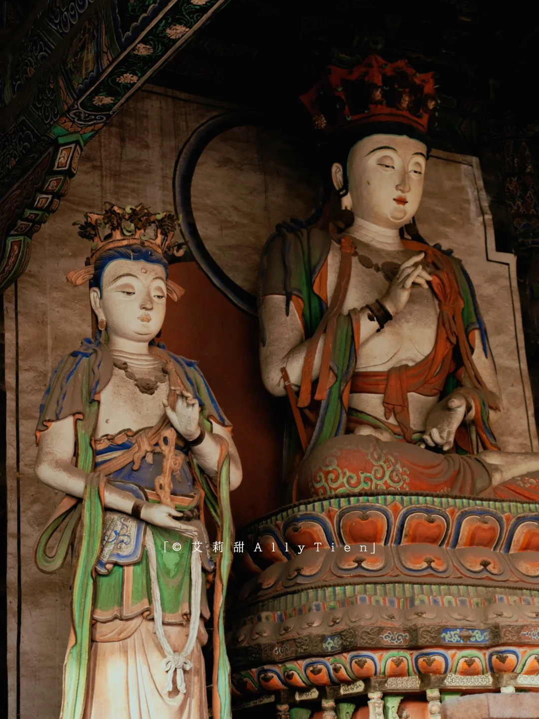 在山西,我总是不经意陷入幻觉。 比如在善化寺, 明明看大雄宝殿外有红色护栏, 走进才发现,那是被殿外红墙“染色”的石栏。 下午4点,冬阳一束束穿过壸门, 昏暗安静的殿内有了光,便有了生机。 看得见五方佛端坐莲台,双目微垂似含远山薄雾。 看得见大吉祥功德天面容平和宁静。 看得见彩绘上,凝固的线条在唱歌,沉淀的色彩在低语。 离开时,月台已隐入暗影, 但大雄宝殿却沐在金色的夕阳下, 我仿佛又陷入了一场幻境, 恍惚间,听见了辽金的钟声。