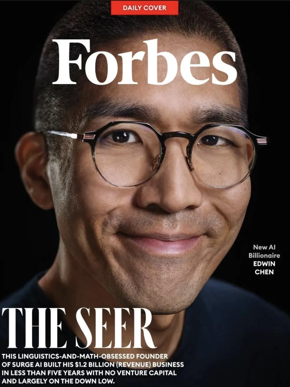 37岁,身家高达180亿美元,登顶美国Z年轻富豪,他就是华裔Edwin Chen。 1988年出生,8岁自学微积分,17岁考入麻省理工,攻读数学、语言与计算机。毕业后,他辗转于对冲基金、Twitter、谷歌、Facebook等大厂积累经验。 32岁,创业成立Surge AI。短短五年,目前个人身家达到180亿美元。 他的崛起,正印证了黄仁勋的预言:AI五年创造的财富奇迹,或将超越互联网的二十年。