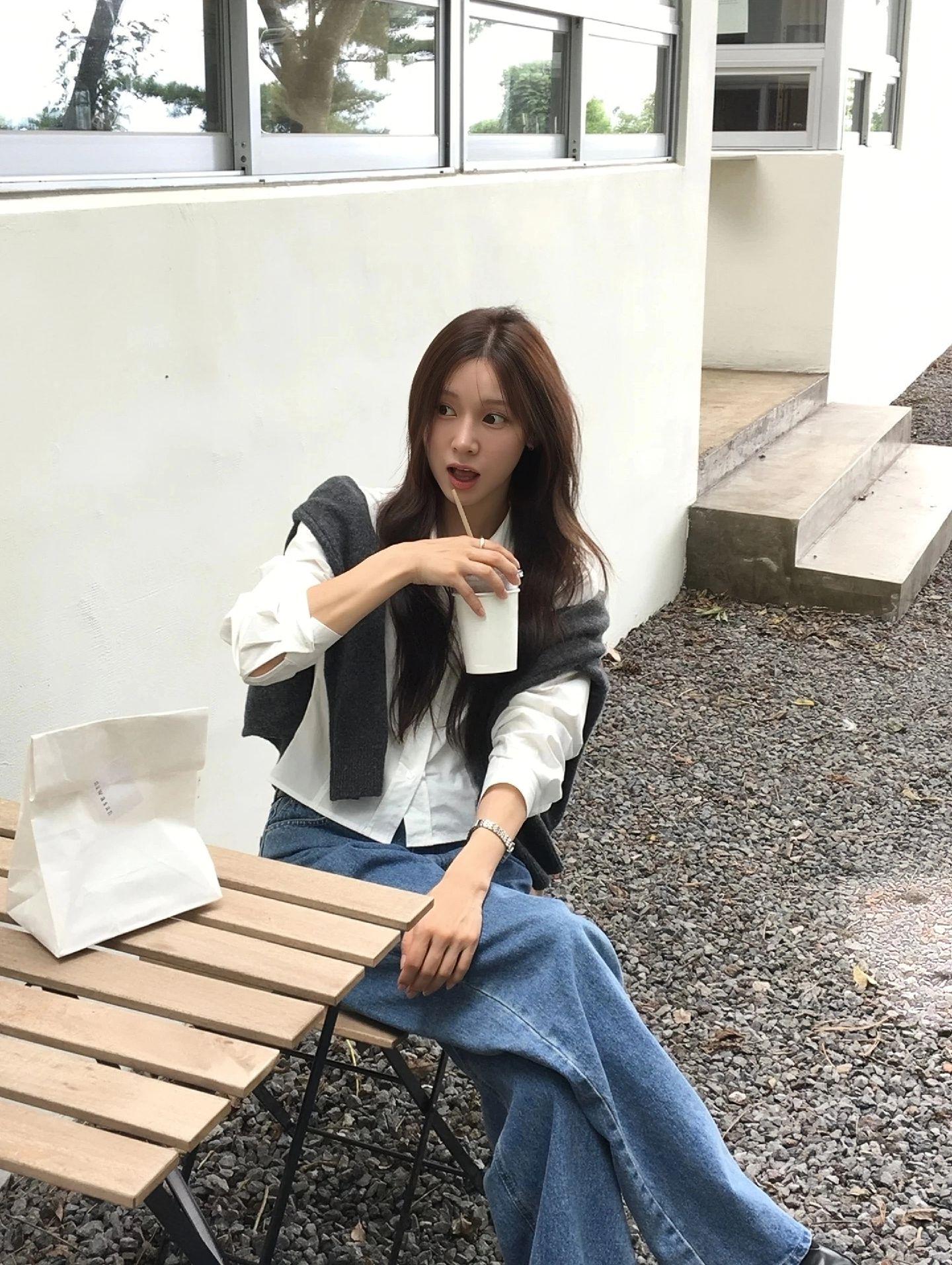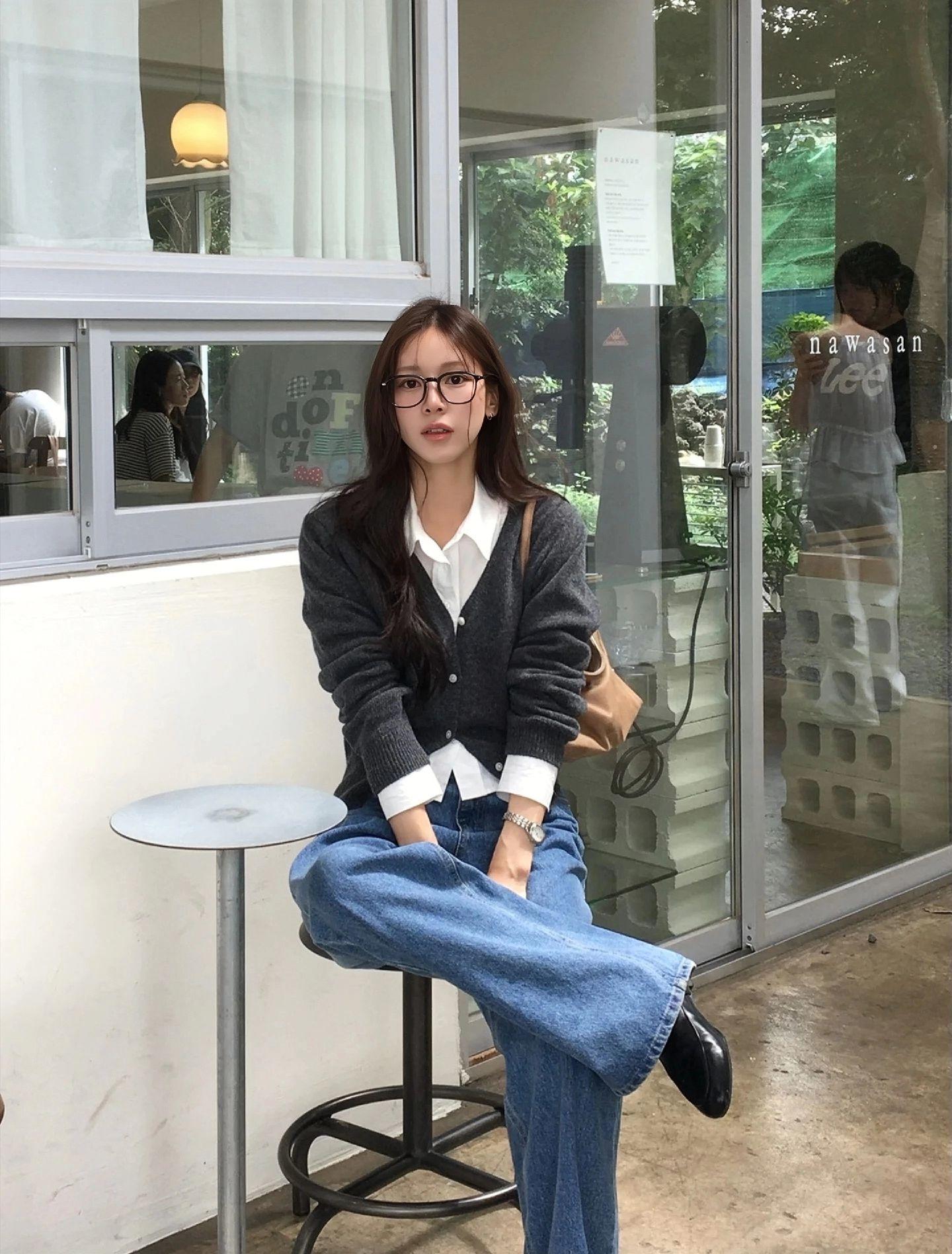 黑衬衫与牛仔堪称都市随行的时尚王炸组合!如黑色V领针织衫搭做旧牛仔裤简约
