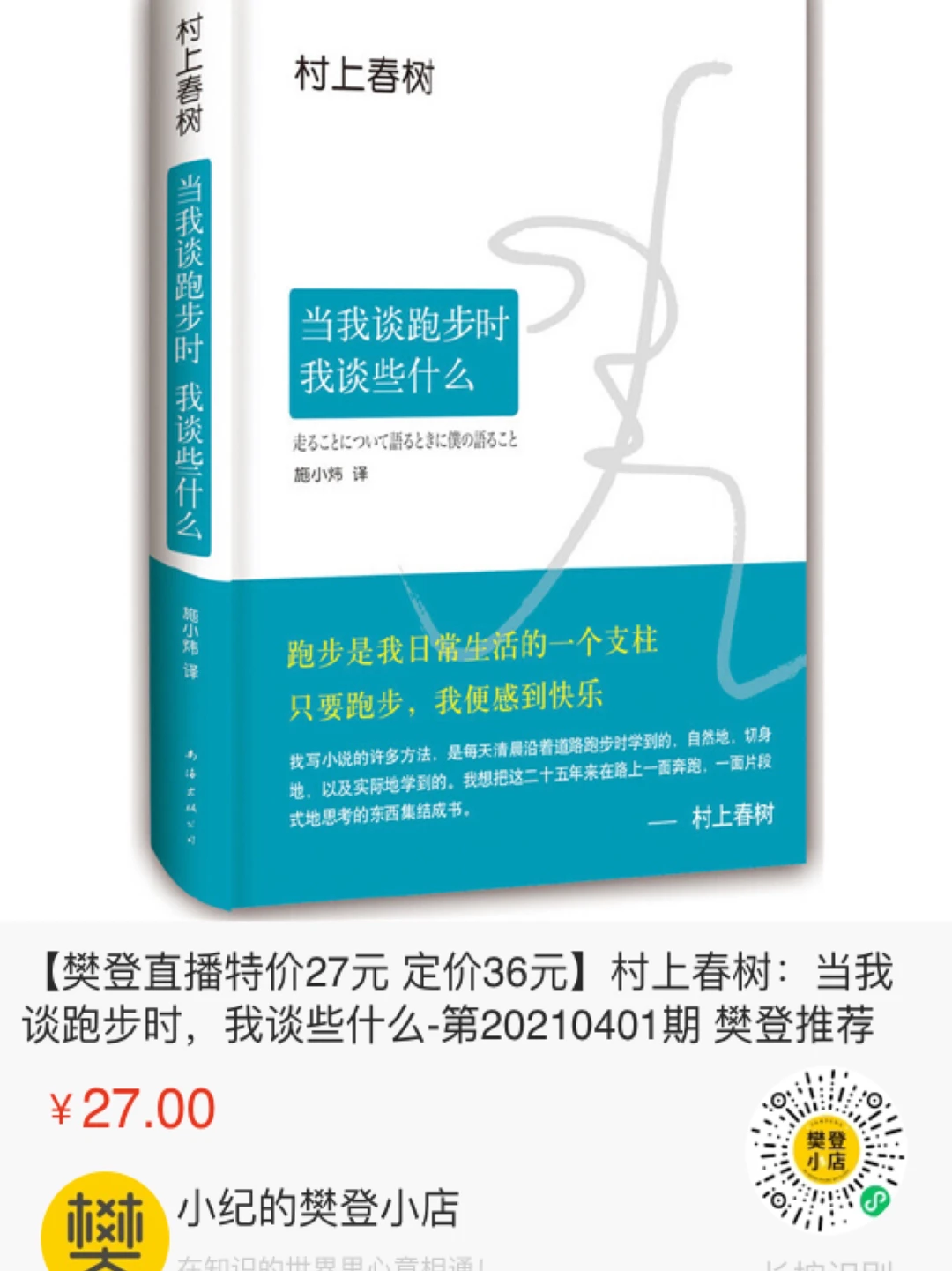《当我谈跑步时,我谈些什么》是村上春树最受欢迎的随笔集。 - 🌟在29岁开始作家生涯之际,他便开始了长跑。从夏威夷的考爱岛,到马萨诸塞的剑桥;从村上市的铁人三项赛,到希腊马拉松长跑古道,他永远在奔跑。 - ❤️“如果说有什么可以战胜的对手,那就是过去的自己。” - ❤️“只要身体允许,我便继续,奔跑不停。” - 村上春树的跑步哲学,令无数人爱上跑步!