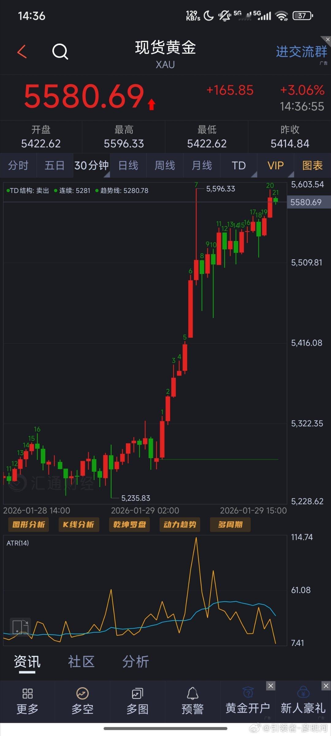 下午好,昨天晚上安排进去多单今天就能止盈!这种行情太过于强势!由于世界格局紧张黄金再次爆拉!现在每天的节奏都是日如此,每天早上起来都有惊喜,我5500的目标已经达到,是否会跟机构预测那般往6000看齐!:5580位置追击短线多单入场,目的地5600(个人观点,仅供参考!)黄金黄金金价