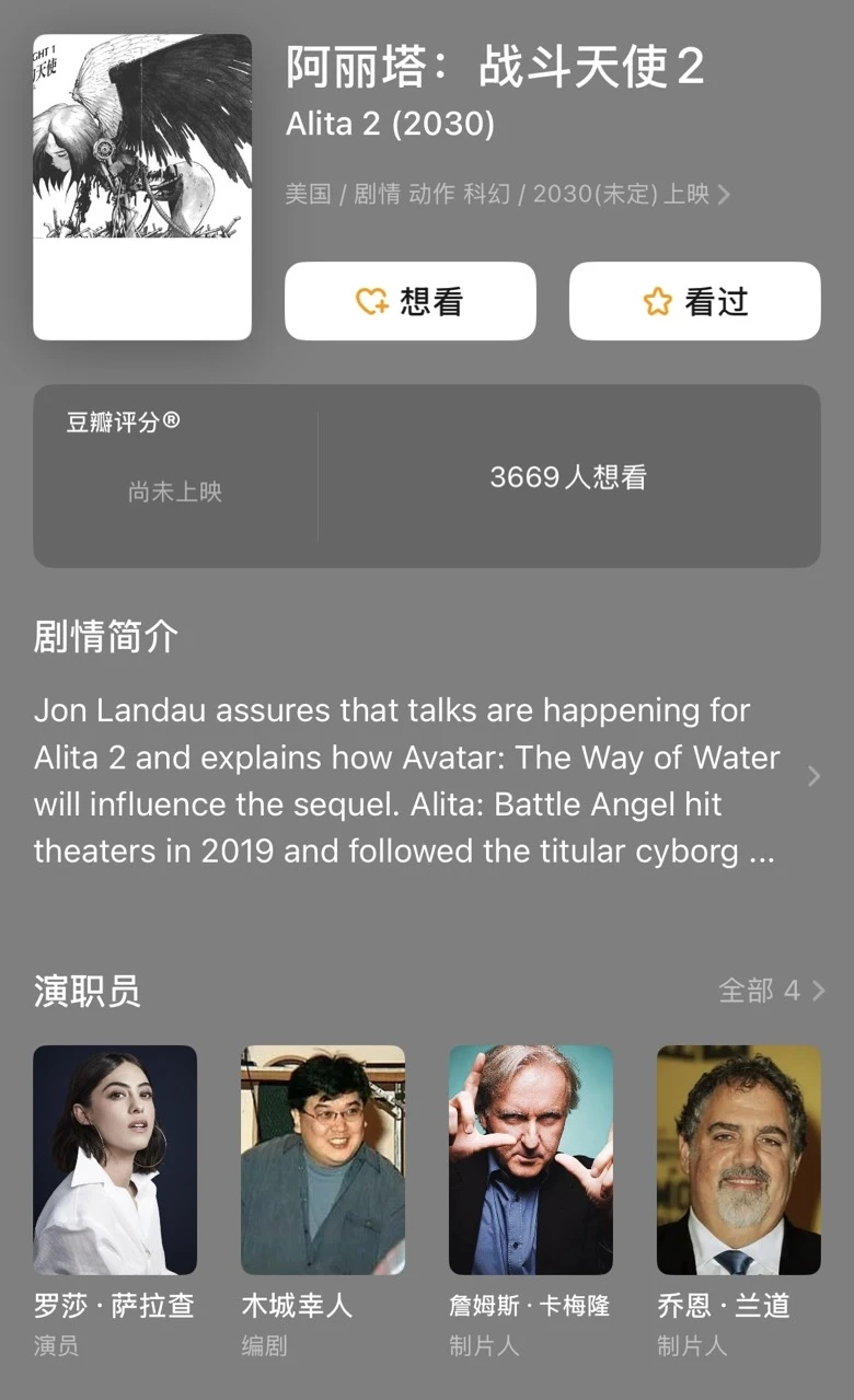 🎬《阿凡达3》上映后 目前最期待卡神的下一部作品就是《阿丽塔2》了 看了一下排期,居然要到2030年才上映 (《阿丽塔》2019年上映,两部相差10年) 比《阿凡达4》还要久(估计2029年上映) 那个时候卡神都76岁了,妥妥的老年人了😂 希望这两个科幻系列能一直拍下去🎬