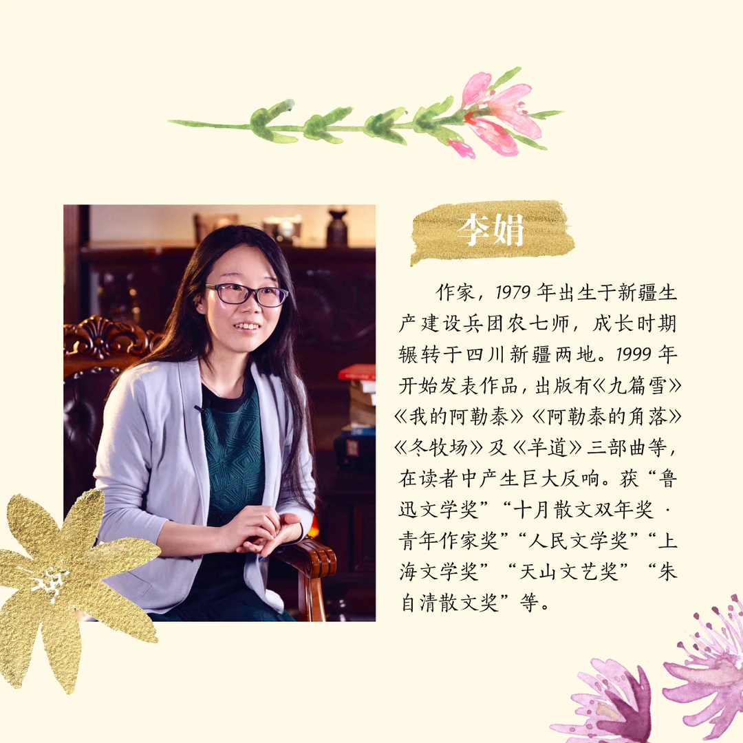 女,作家。1979年出生于新疆生产建设兵团农七师,成长时期辗转于四川新疆两地,有过一段阿勒泰牧场上的生活经历。1999年开始发表作品,曾在《南方周末》《文汇报》等开设专栏,出版有散文集《九篇雪》《我的阿勒泰》《阿勒泰的角落》《走夜路请放声歌唱》《记一忘三二》等,长篇散文《冬牧场》及《羊道》三部曲,诗集《火车快开》。在读者中产生巨大反响。曾获“人民文学奖”“上海文学奖”“天山文艺奖”“朱自清散文奖”等,其中《阿勒泰的角落》在海外有法语版和韩语版发行。